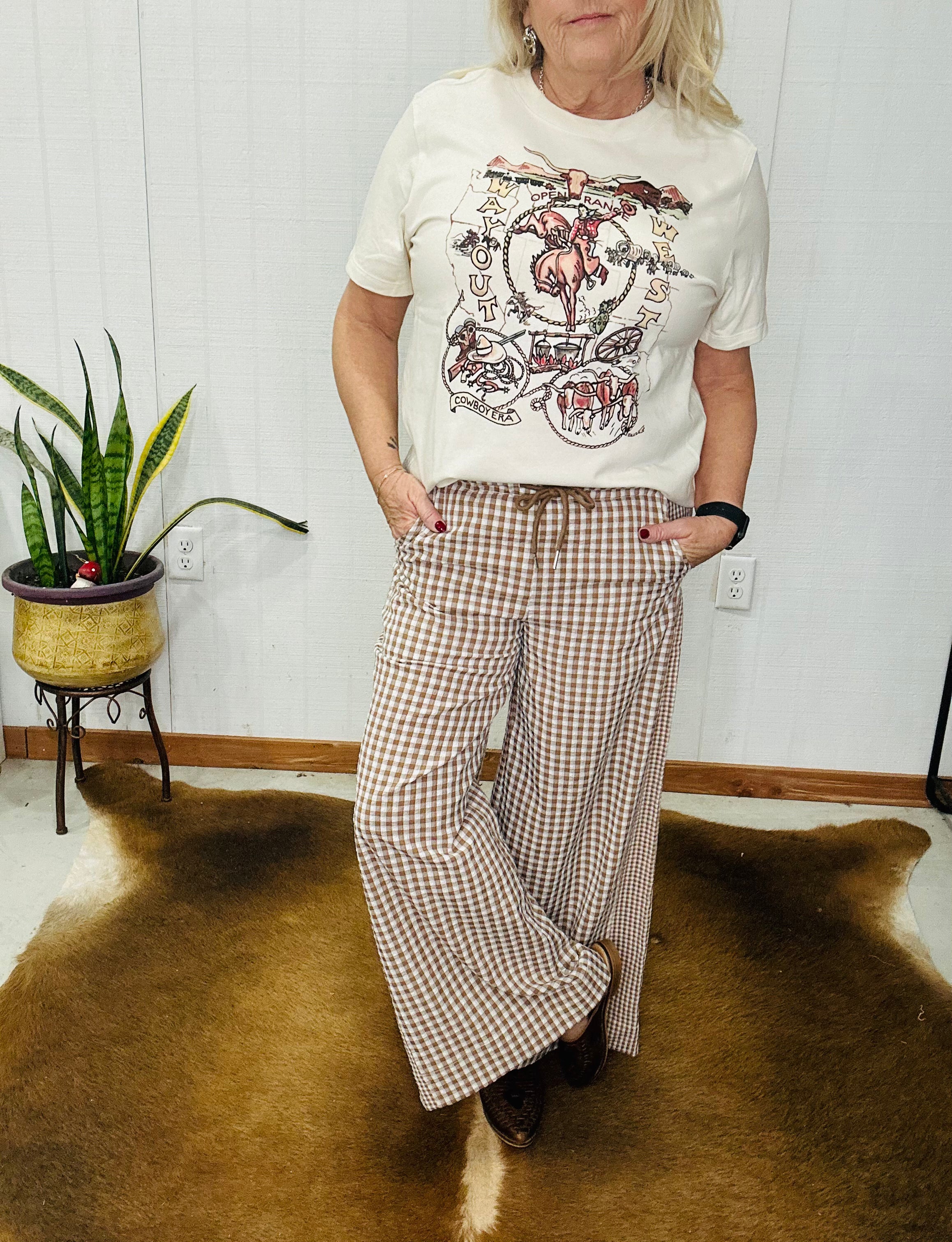 Meet your new “throw on and go” pants. The Chester Checkered Wide Leg Pants give you that cool, put-together look without sacrificing comfort. The mocha and white mixed check print feels fun and modern, while the elastic waist with drawstring keeps things easy for busy days on the go. Dress them up with a crisp blouse and booties for work, or keep it casual with a simple tee and denim jacket for errands, school runs, or brunch. Lightweight with that seersucker-style texture, these are the kind of pants you’ll reach for again and again.