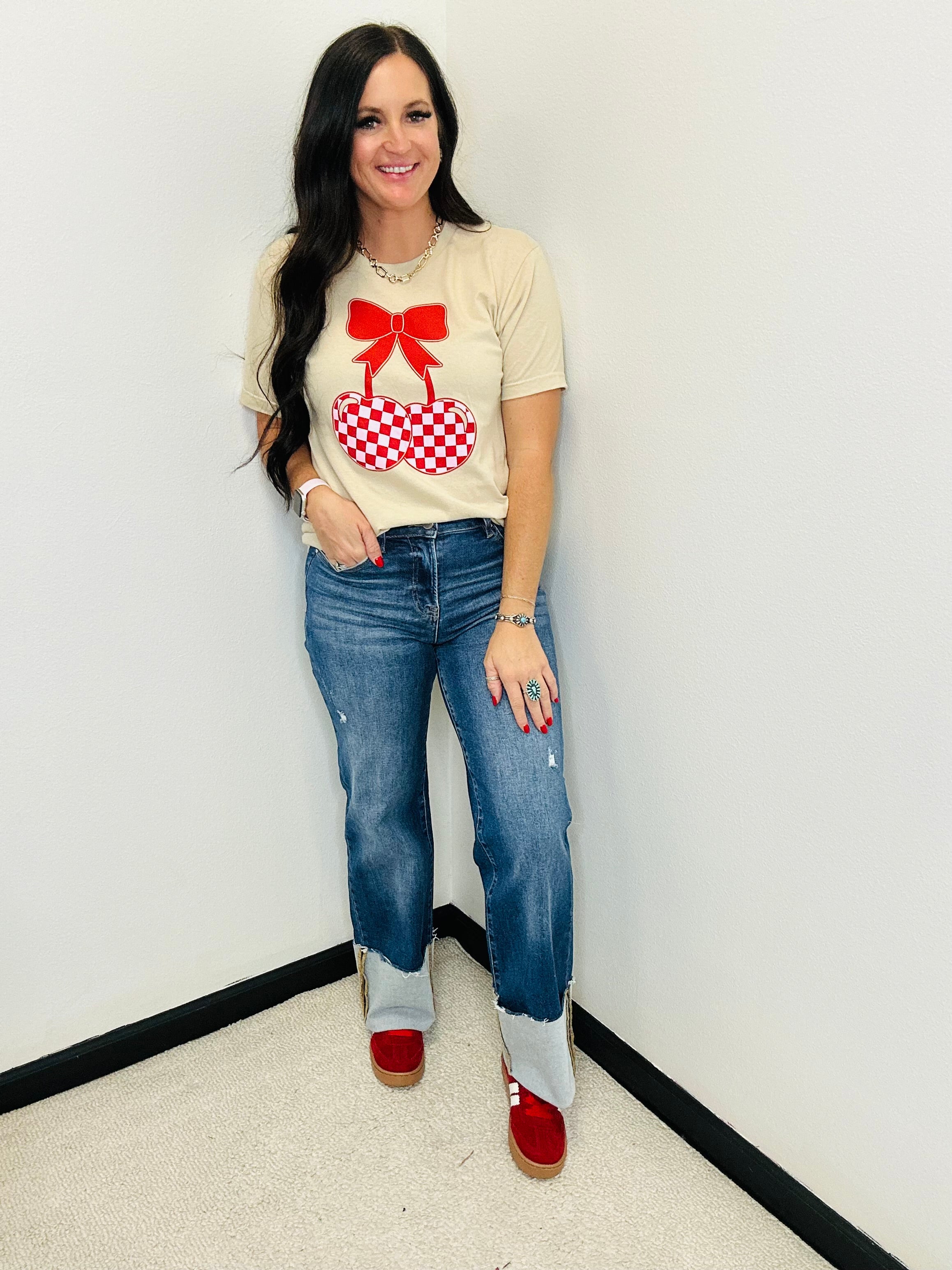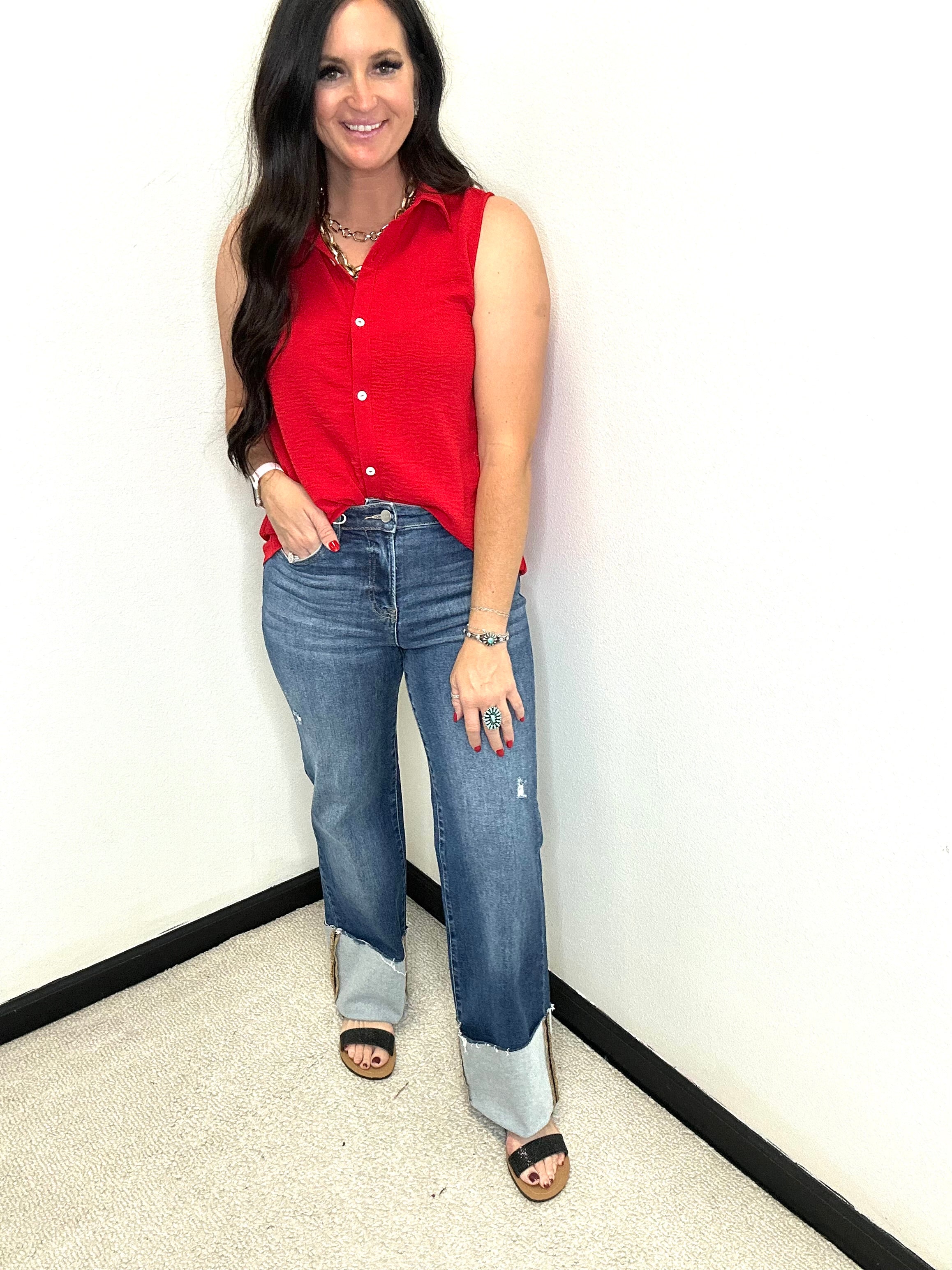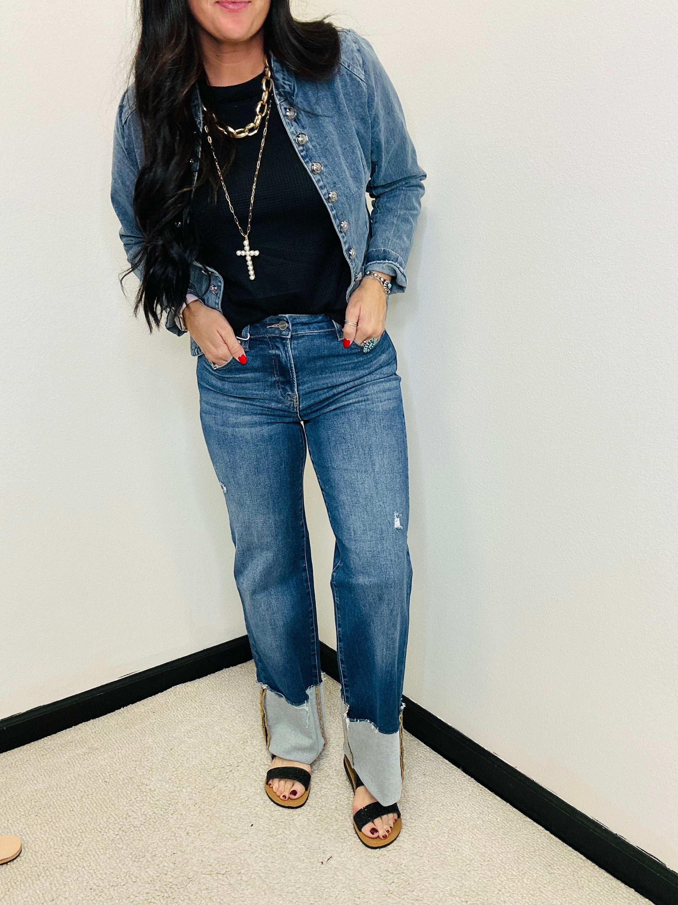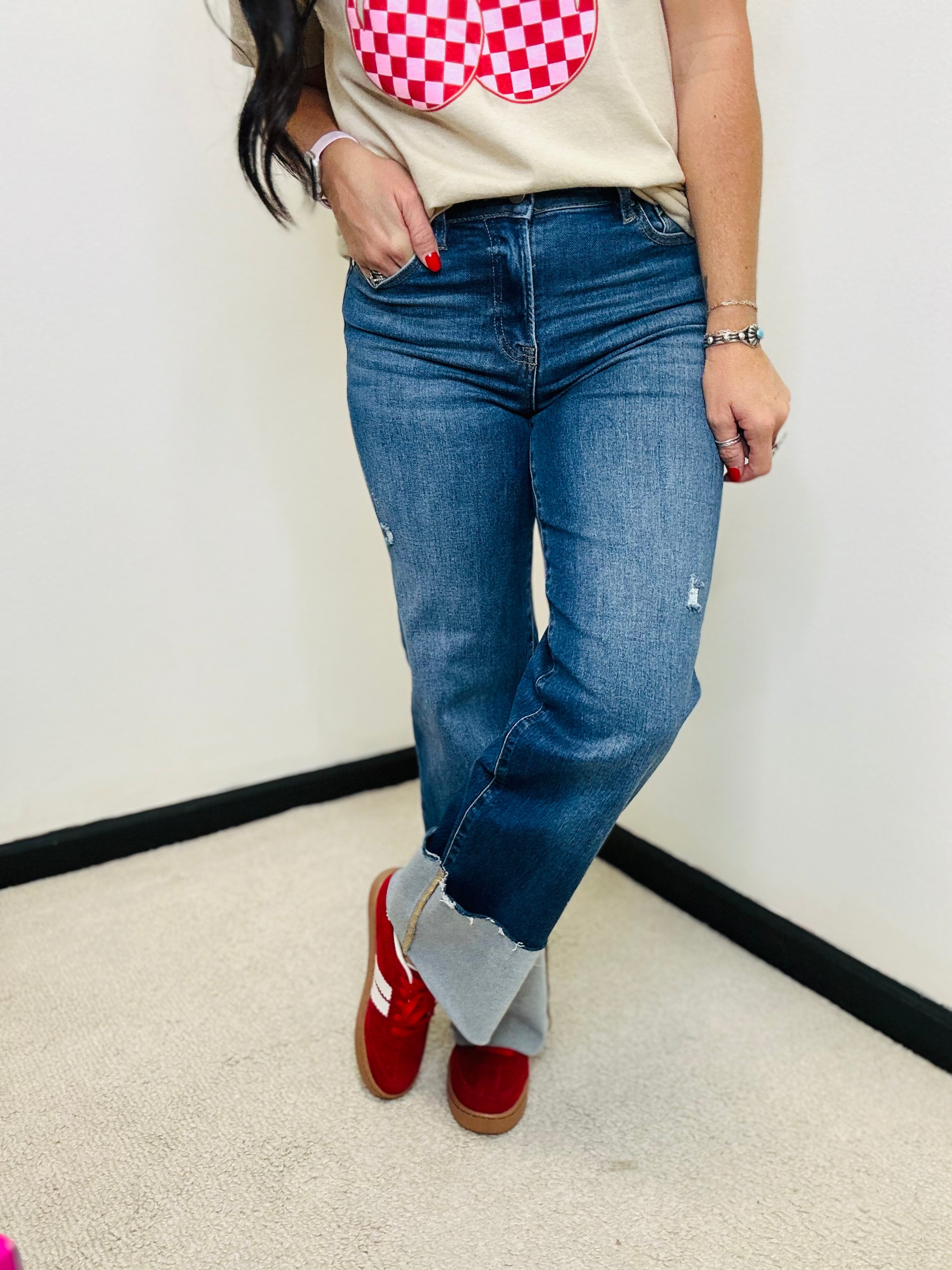 Risen High rise Ankle Wide Cuffed Straight Jeans in Dark Wash