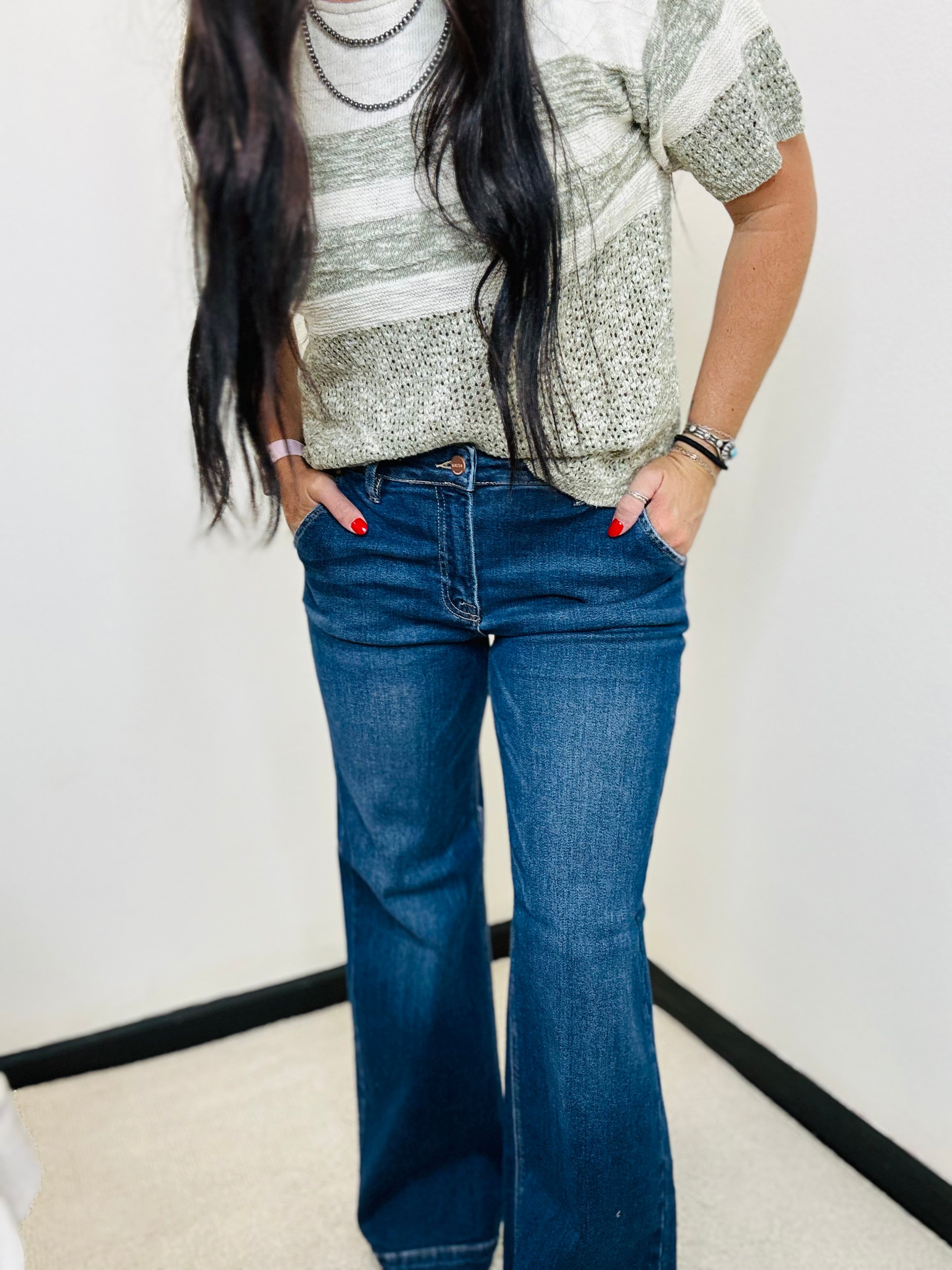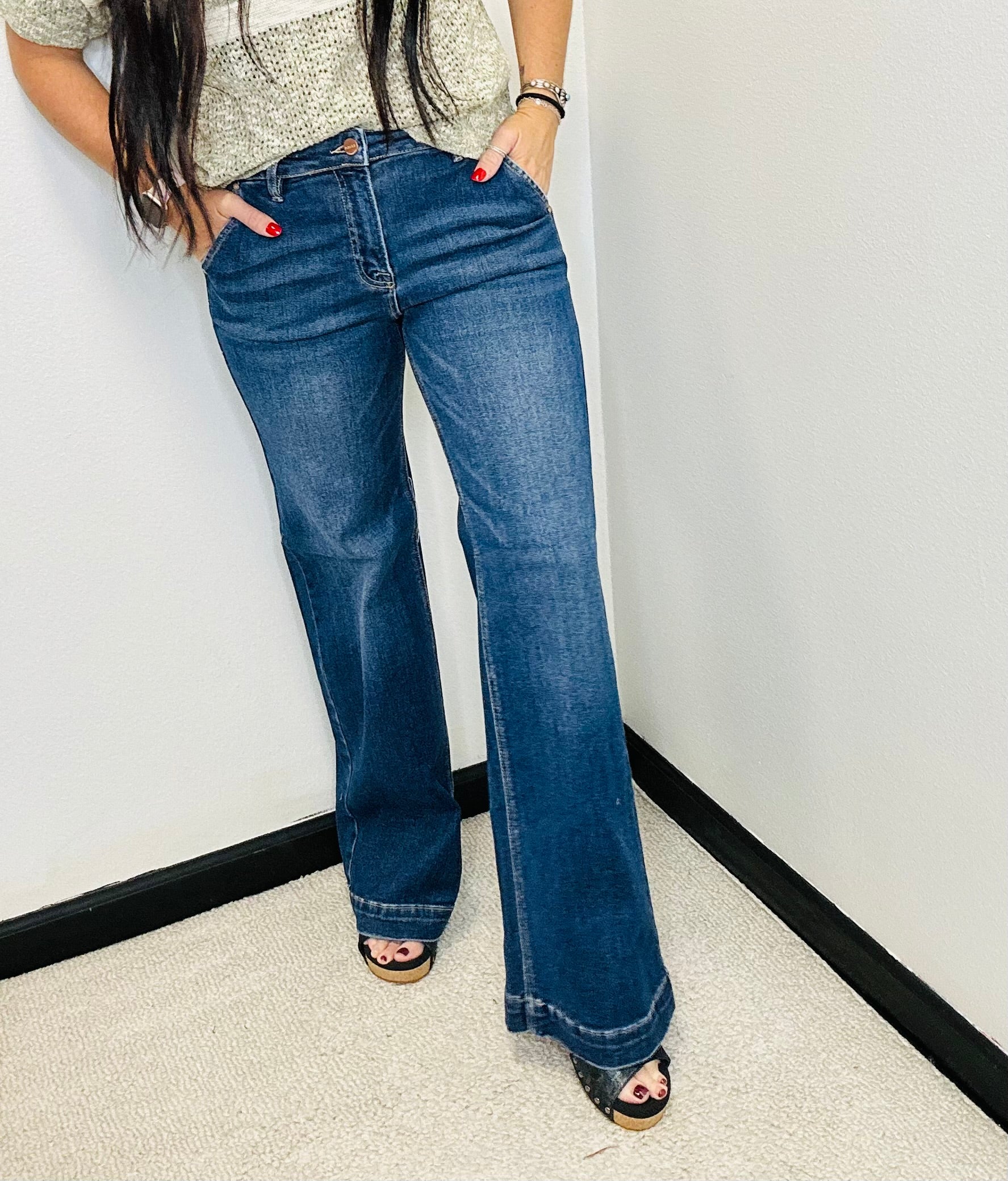 Risen High Rise Dark Wash Trouser Style Wide Leg Jeans