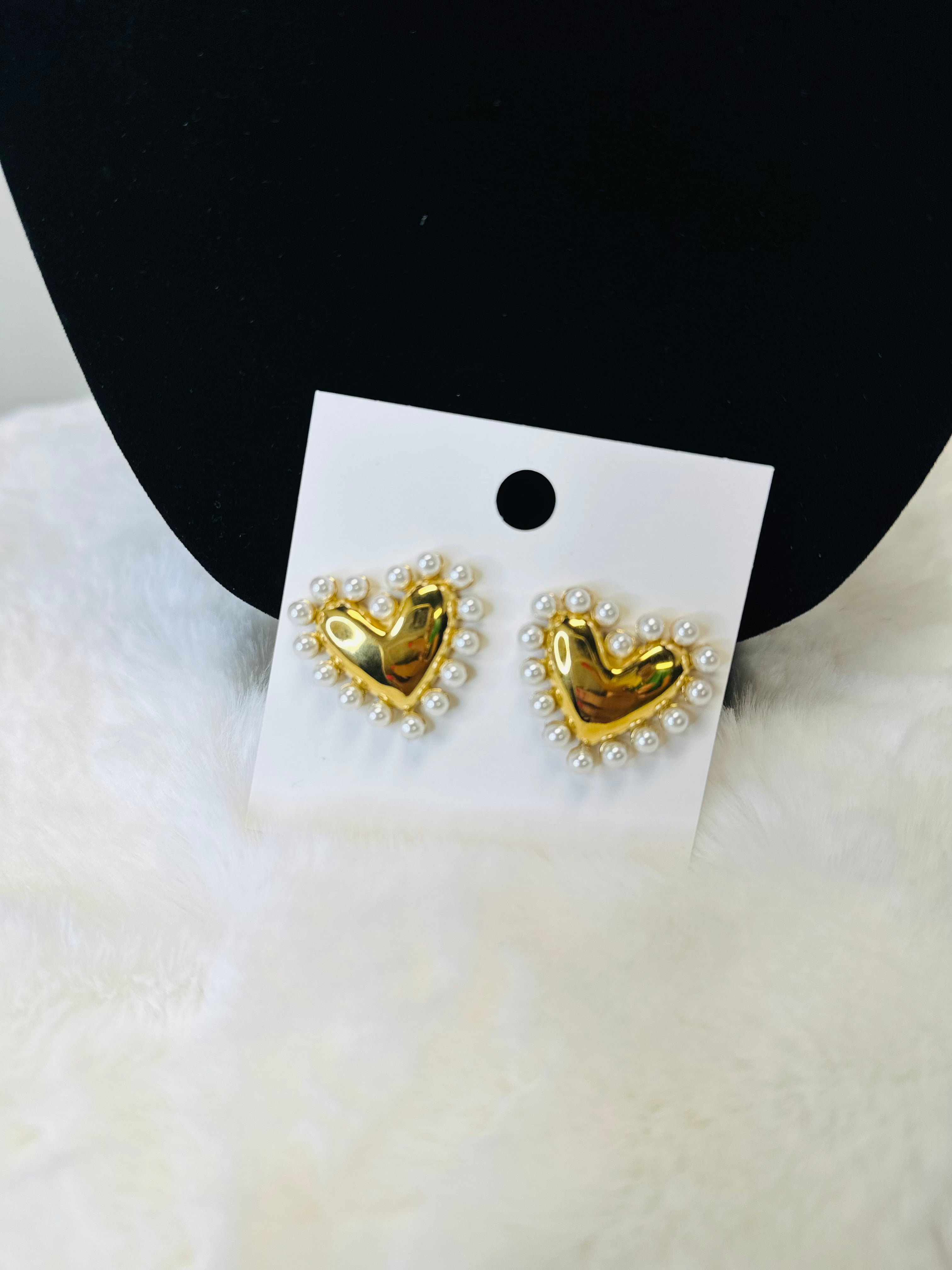 The Chan Gold Pearl Heart Earrings feature gold heart-shaped posts accented with pearls and are designed to be water resistant for lasting wear.