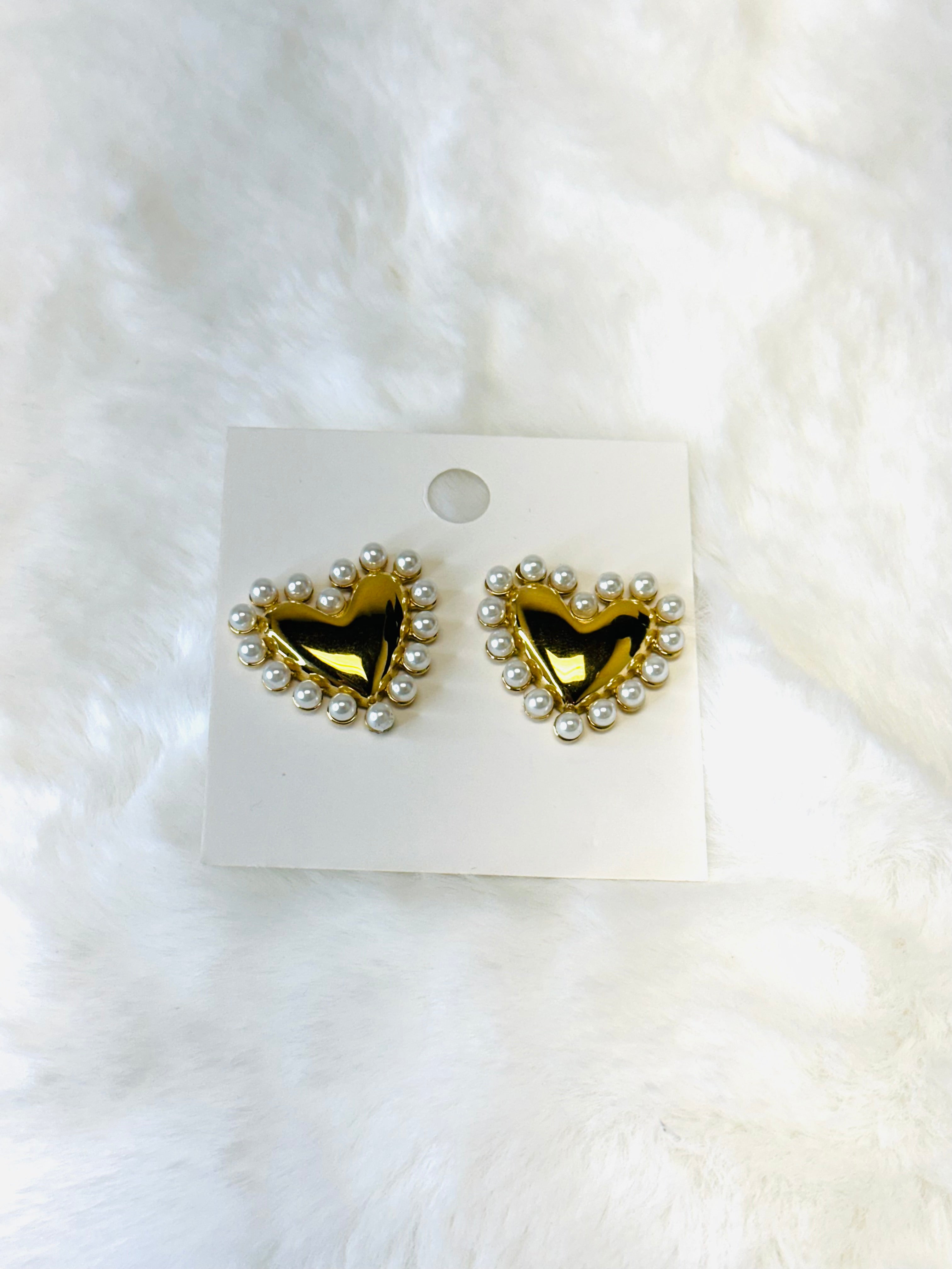 Gold Heart Post Earrings with Pearl Accents