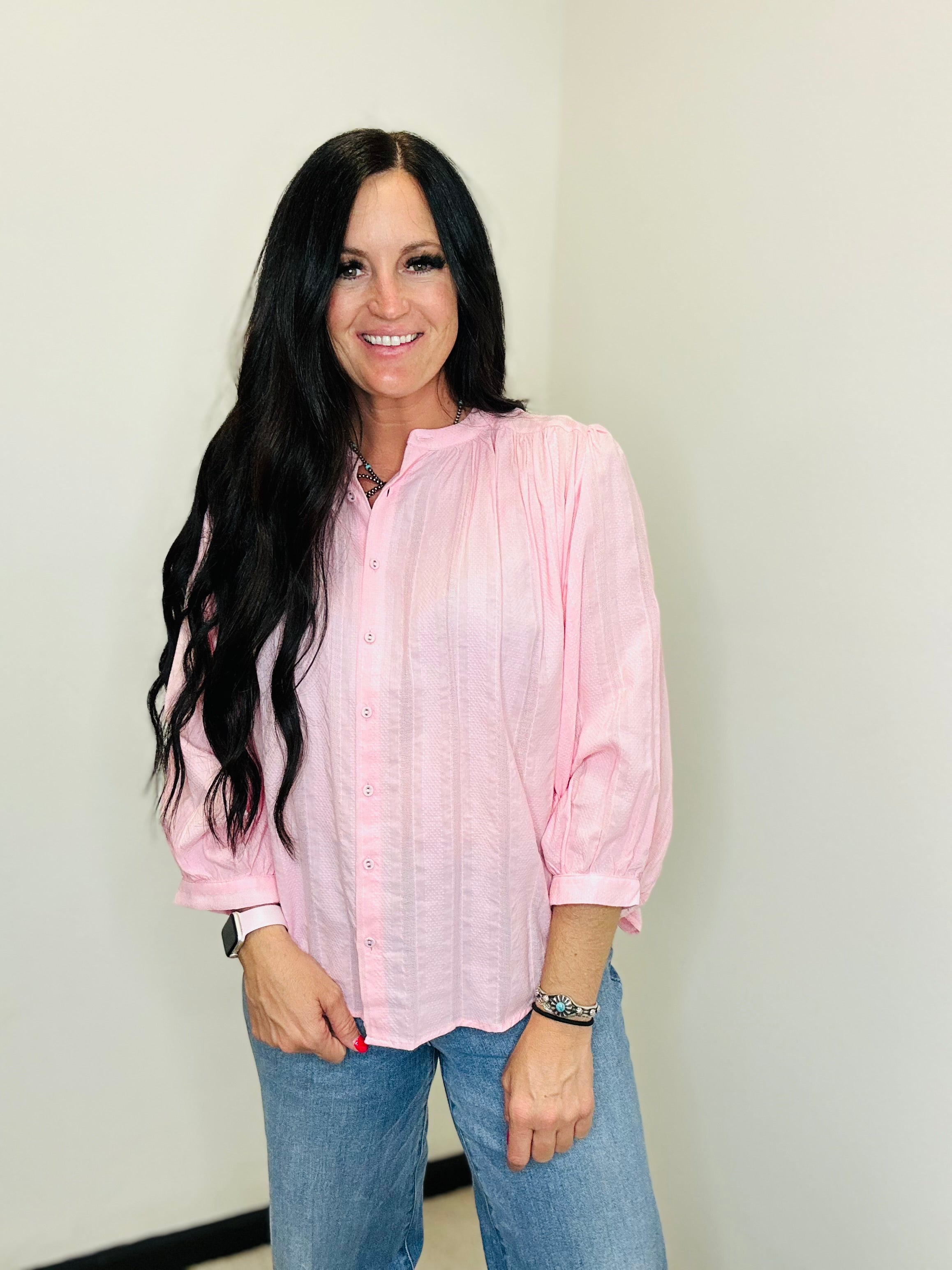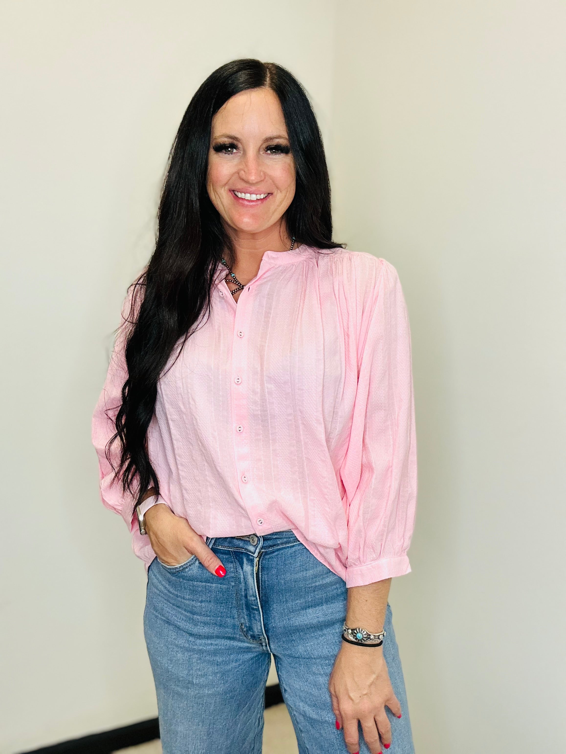 Elevate your casual wardrobe with our Pamela Pink Button Up Blouse! This playful piece features a chic mandarin collar, convenient 3/4 sleeves, and a breezy lightweight fabric that's perfect for any season. The drop shoulder design and relaxed fit create a carefree silhouette that's as comfortable as it is stylish. Button it up for a polished look or leave a few undone for effortless charm!