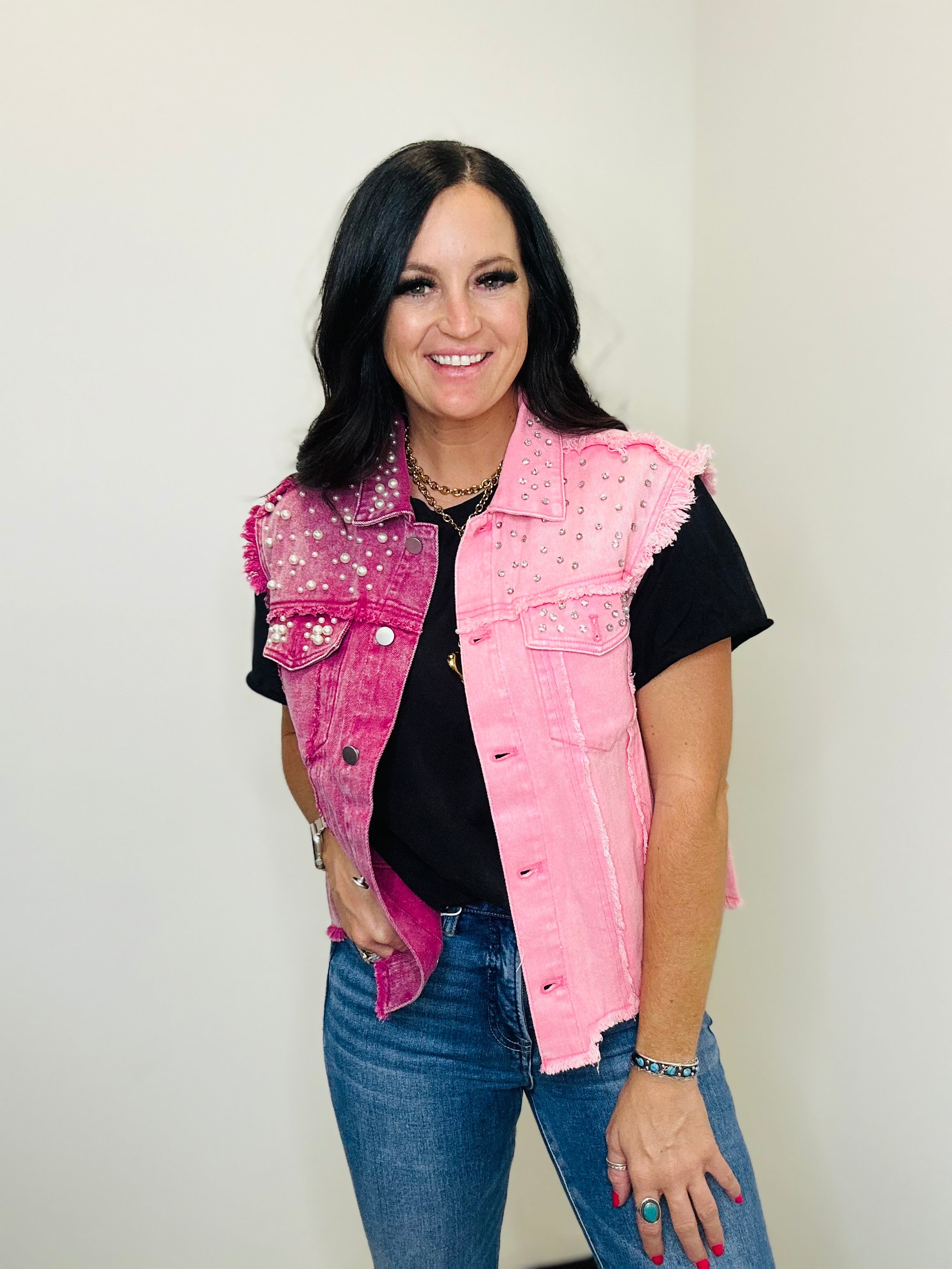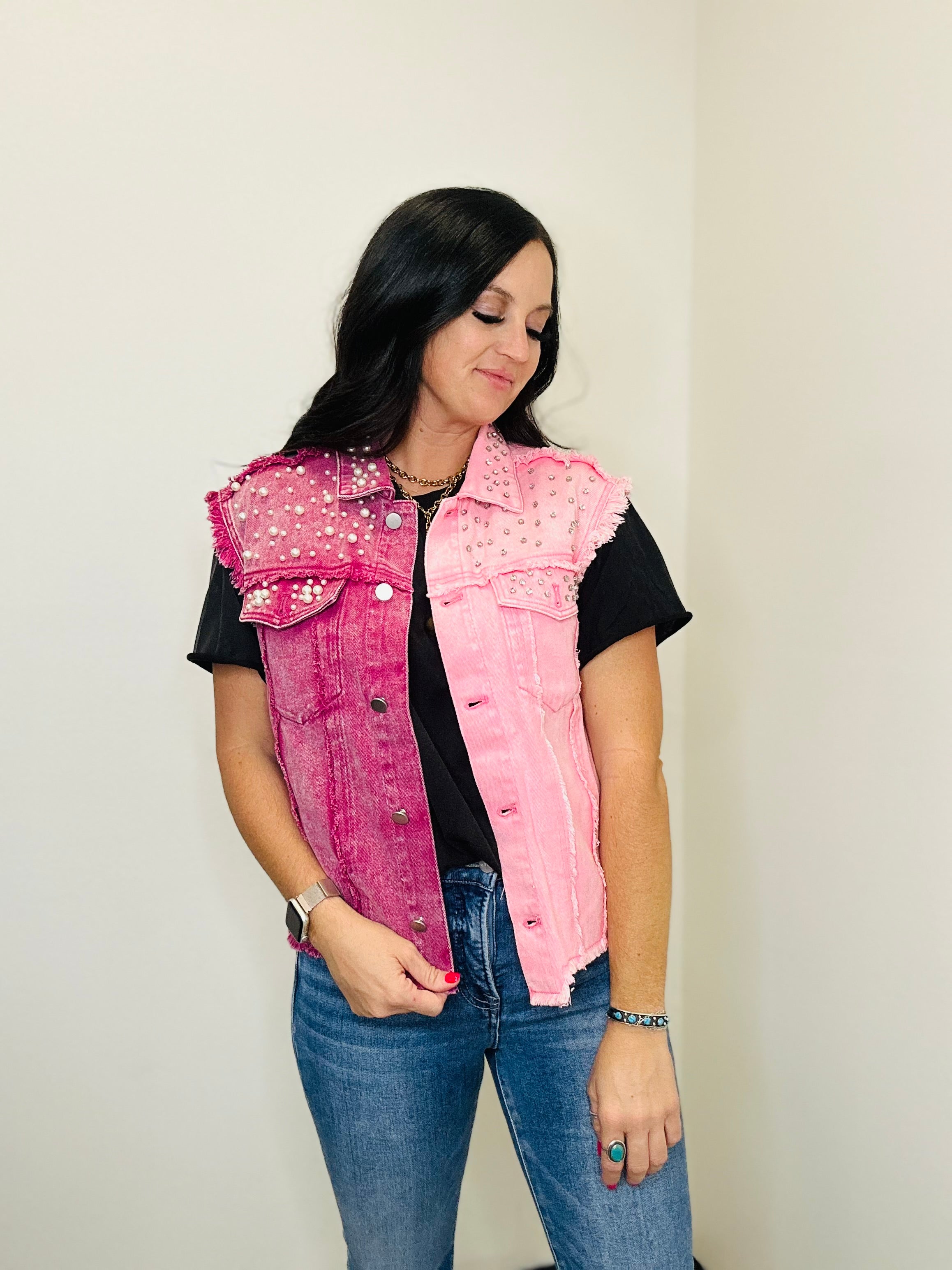 Women's Two Tone Pink & Fuchsia Sleeveless Denim Vest with Crystal & Pearl Embellishments