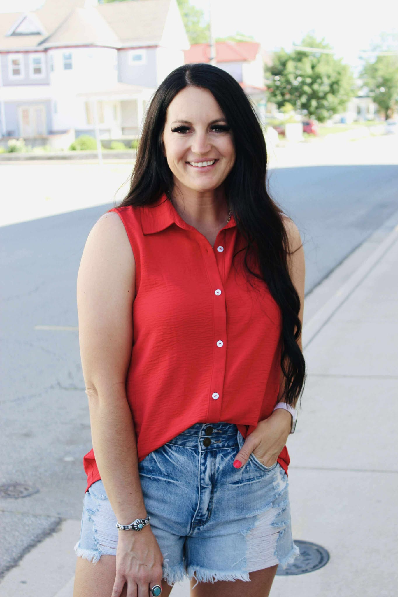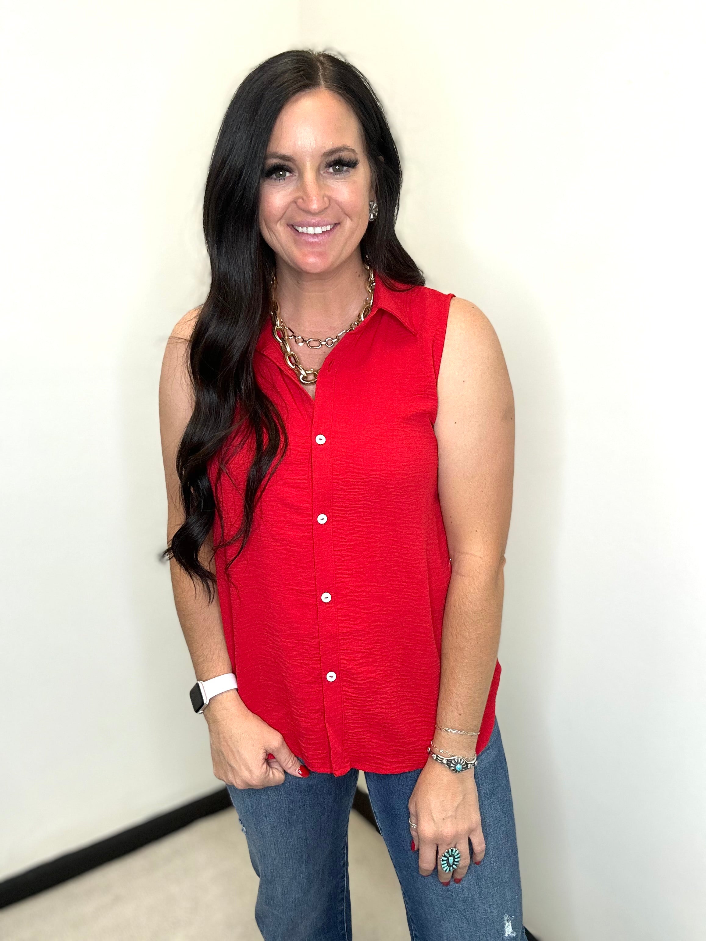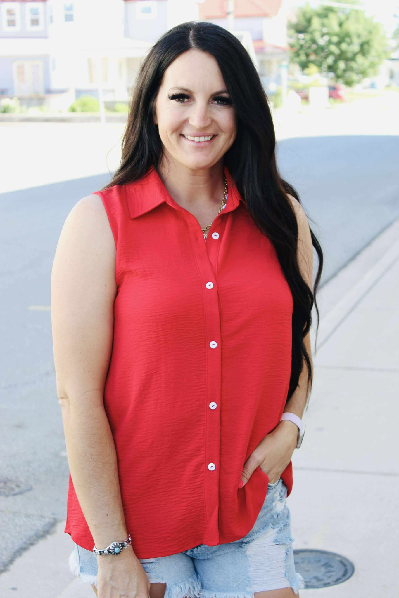 Go for a fresh and breezy look with this Andree by Unit Sleeveless Button Down Blouse in red. The button front design and collared neckline add a touch of sophistication, while the flowy and rounded bottom gives a flattering and comfortable fit. Perfect for any occasion!