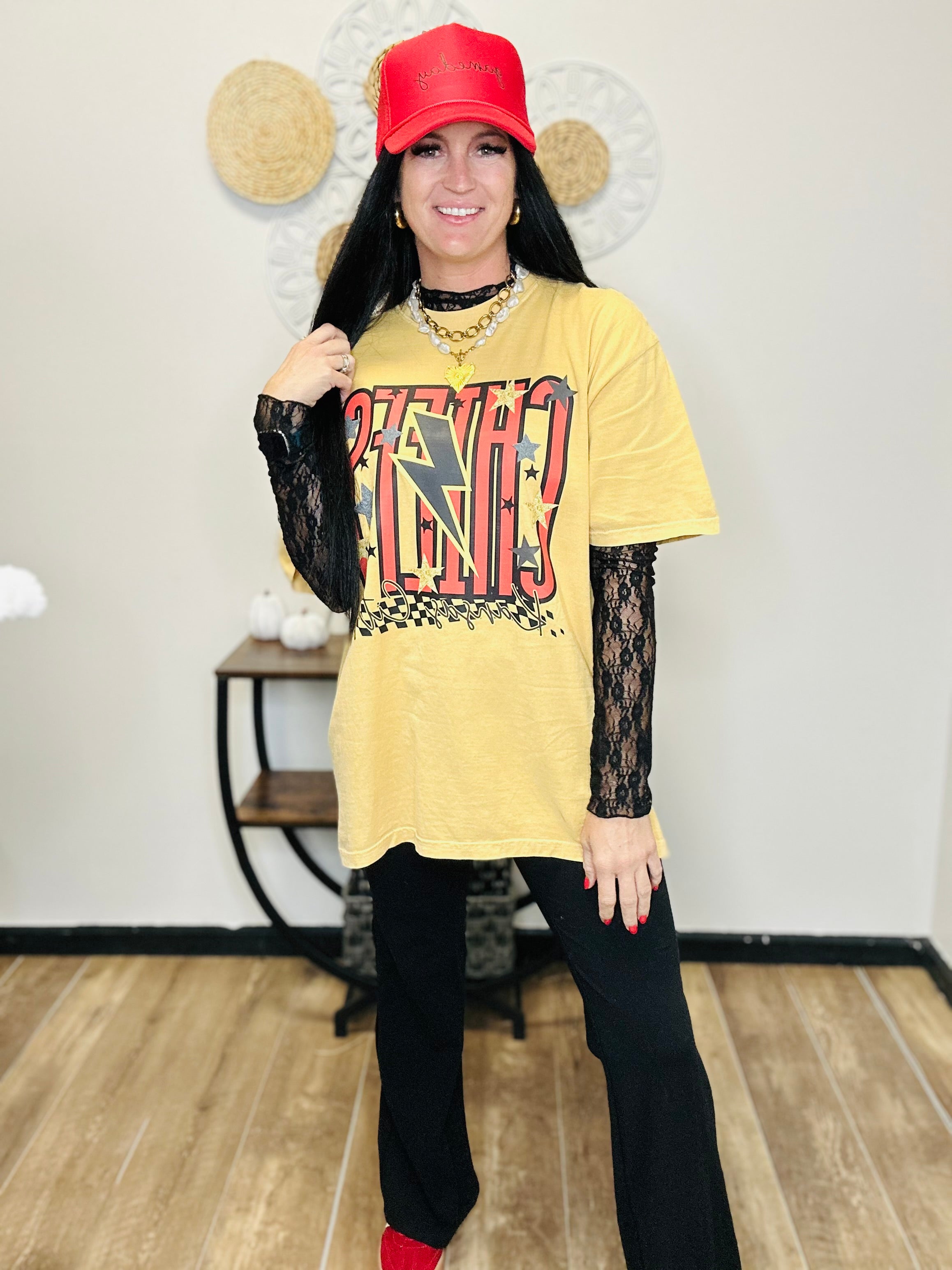 Light up game day with our Gold Chiefs Racing Lightning Bolt Tee. Printed on a soft 100% cotton Comfort Colors tee, this bold design pairs a racing-inspired lightning bolt with KC football pride—perfect for standing out in the crowd.
