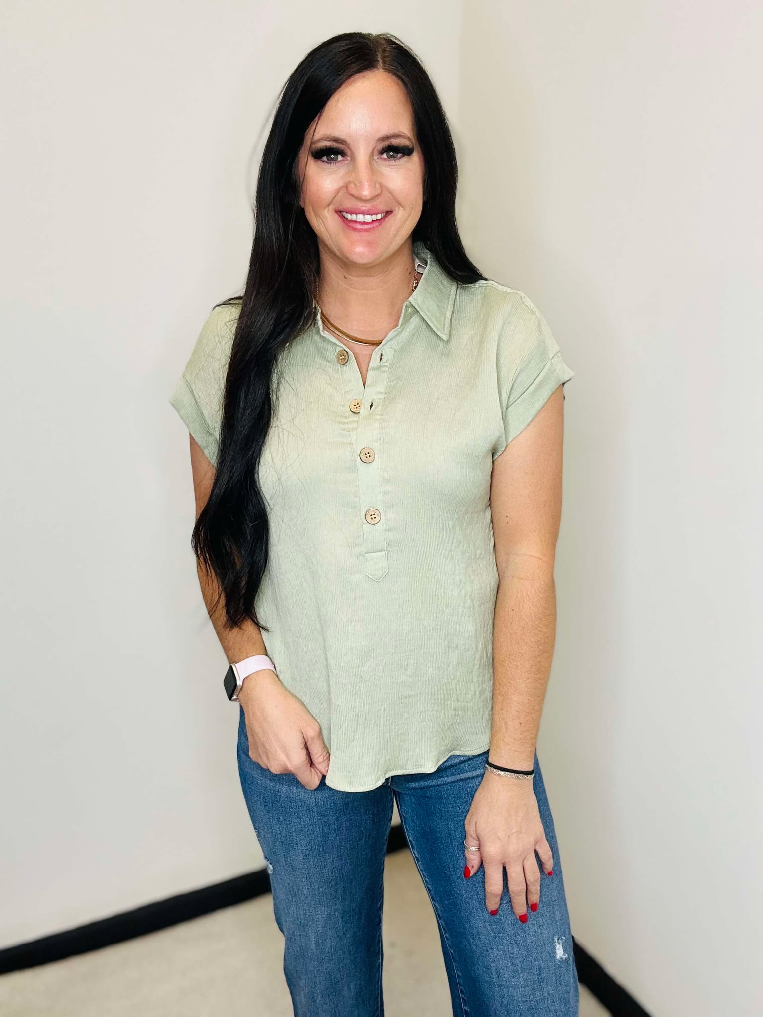 Women's Short Sleeve Half Button Front Olive Linen Blend Top
