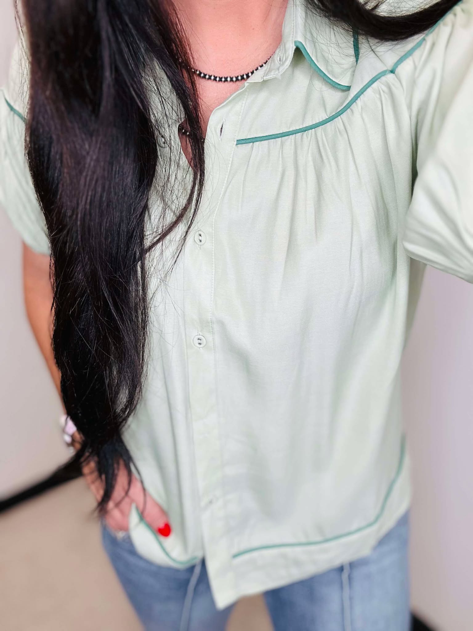 Women's Short Sleeve Button Down Flowy Sage Green Top