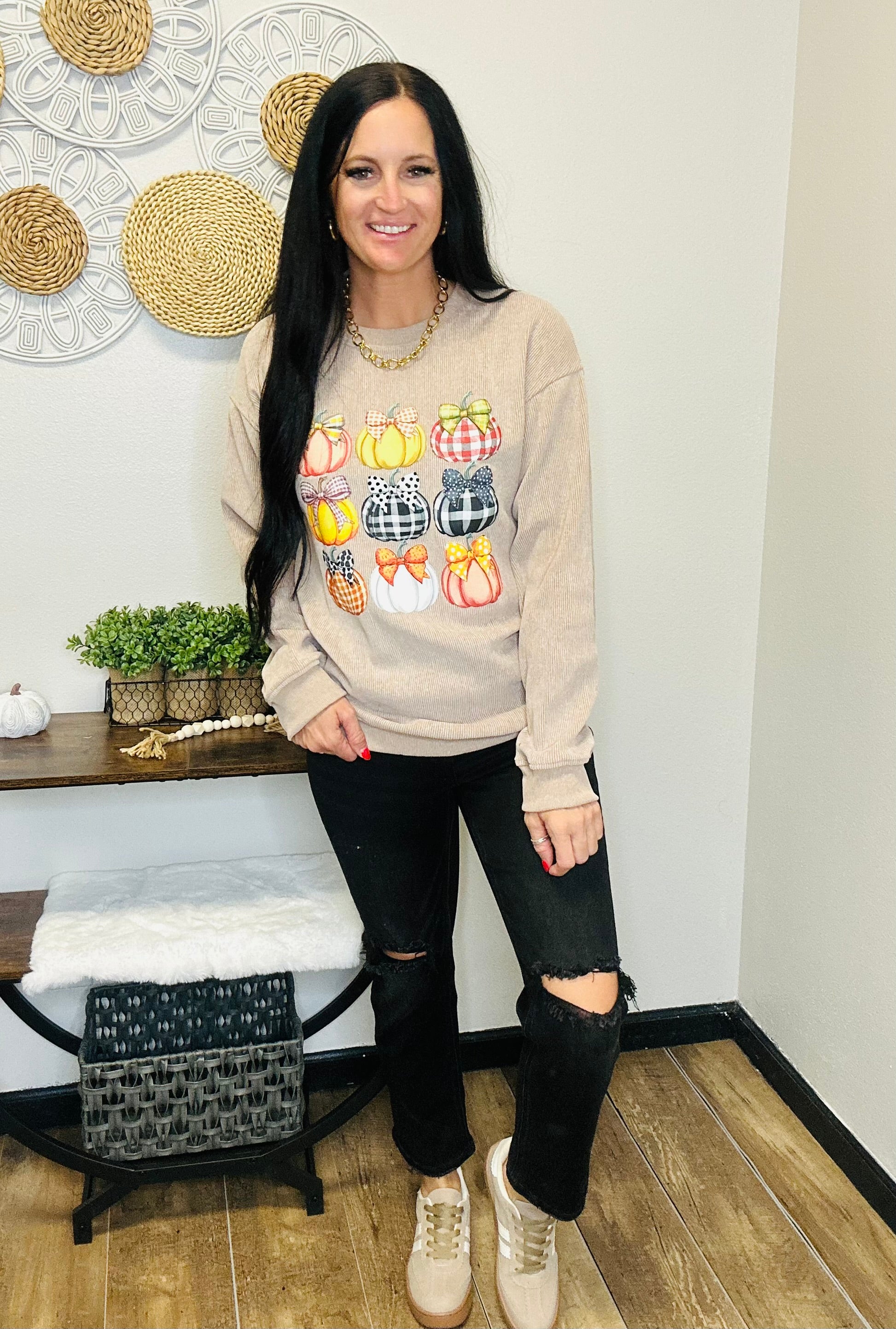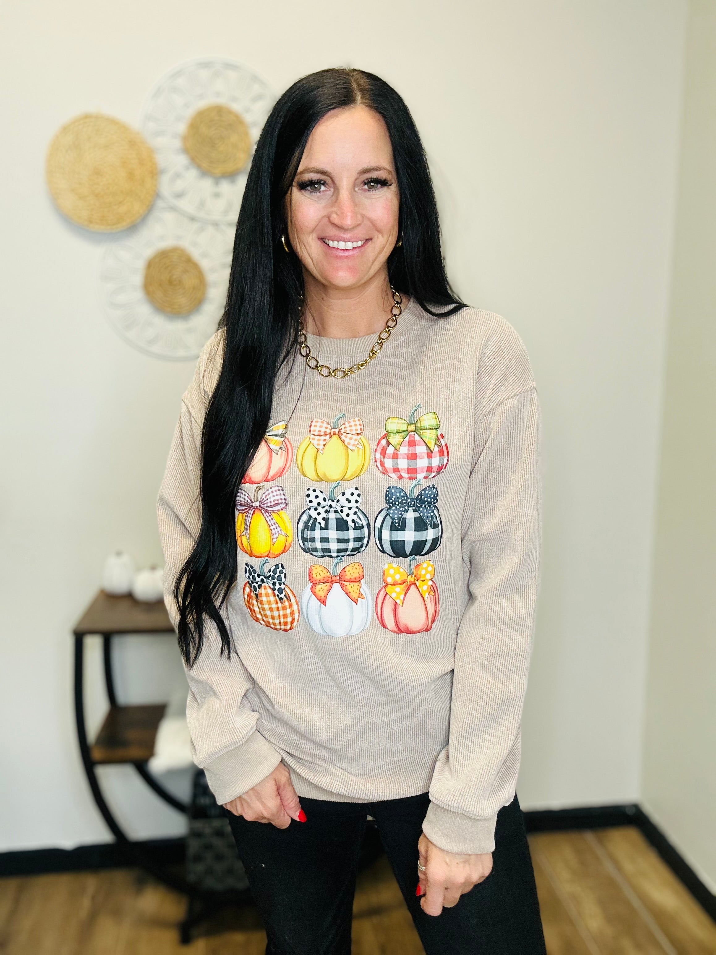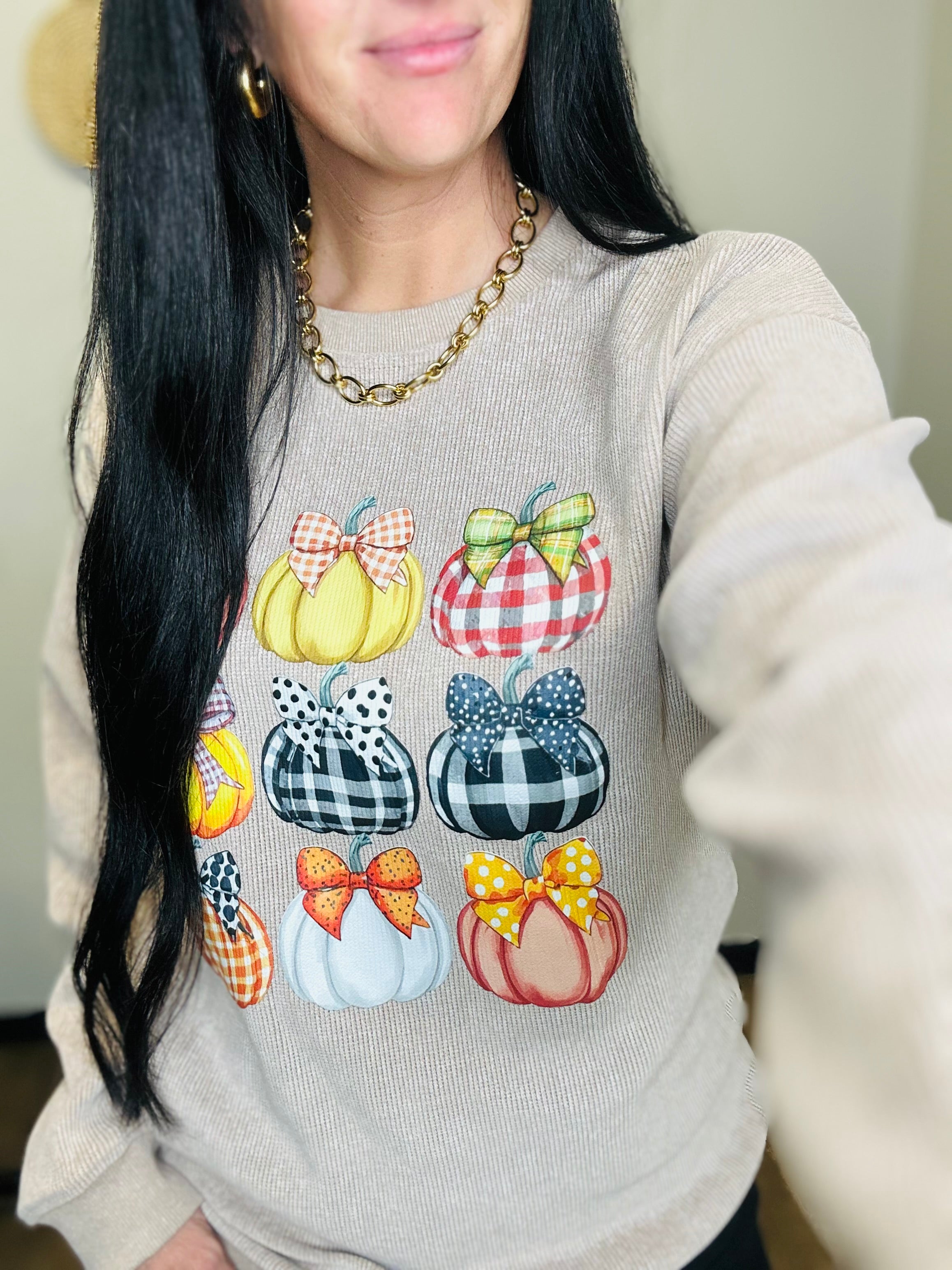Cozy meets cute in our Pumpkin Bow Corded Pullover. Designed in a soft khaki tone with an over sized fit, this textured corded sweatshirt brings a feminine twist to fall style. The playful pumpkin graphic topped with a sweet bow makes it the perfect pick for pumpkin patch days, cozy coffee runs, or festive fall gatherings. With its relaxed drop-shoulder design and ribbed trim, this pullover offers both comfort and charm for the season ahead.