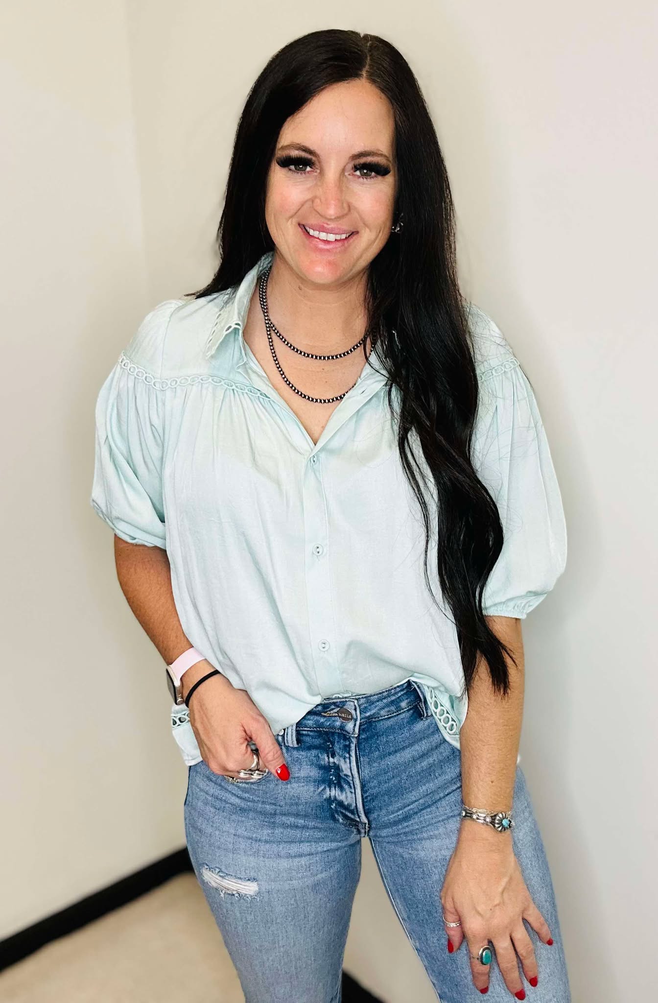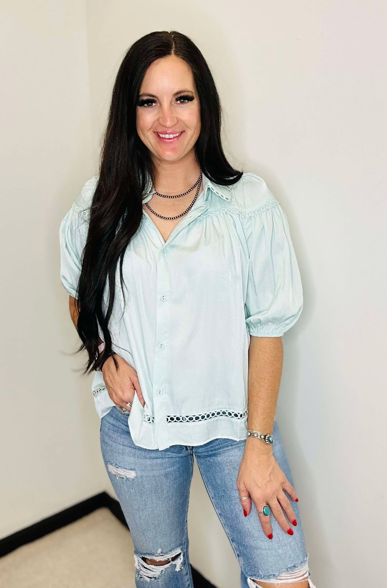 Tosha Blue Baby Doll Button Down Blouse