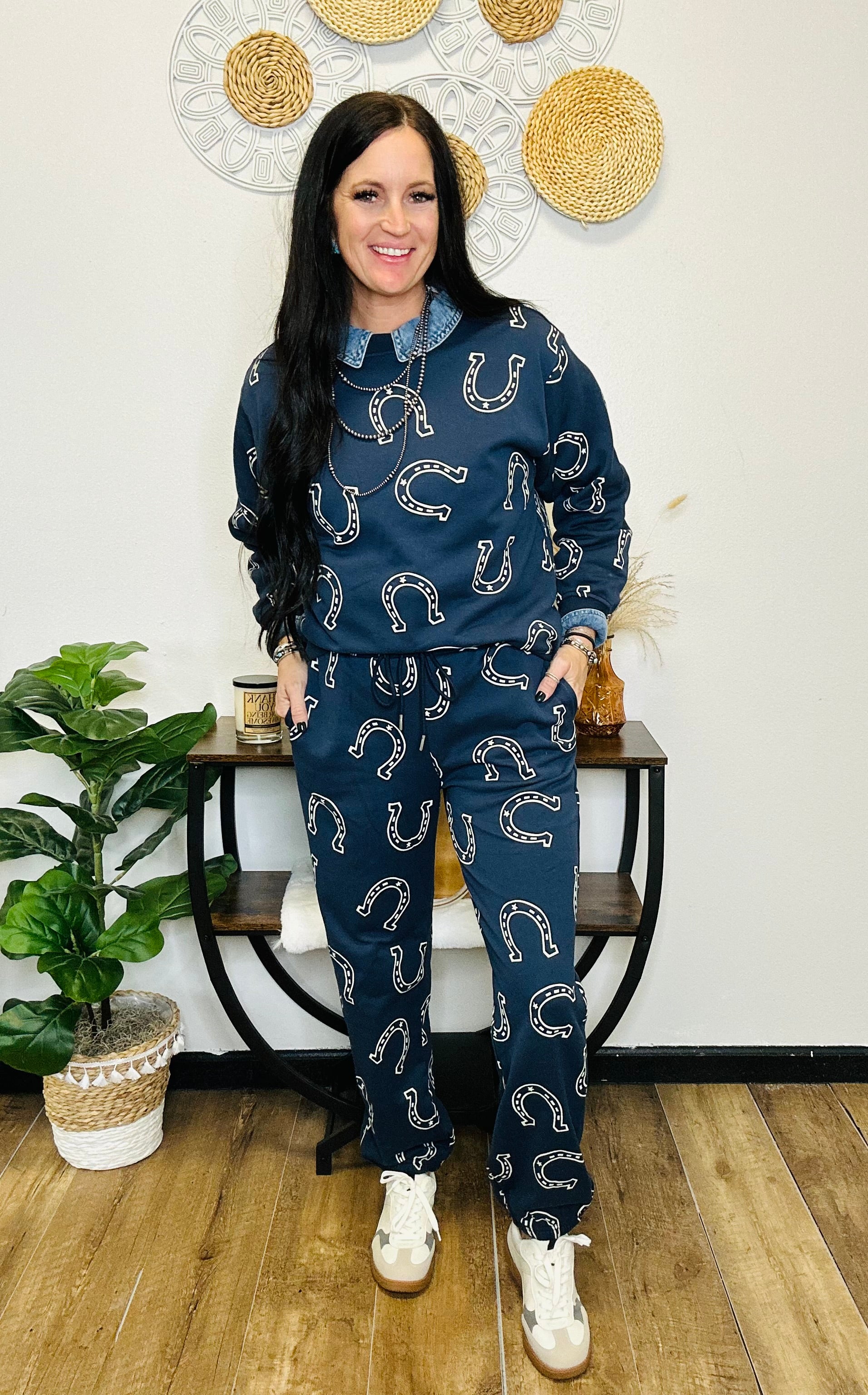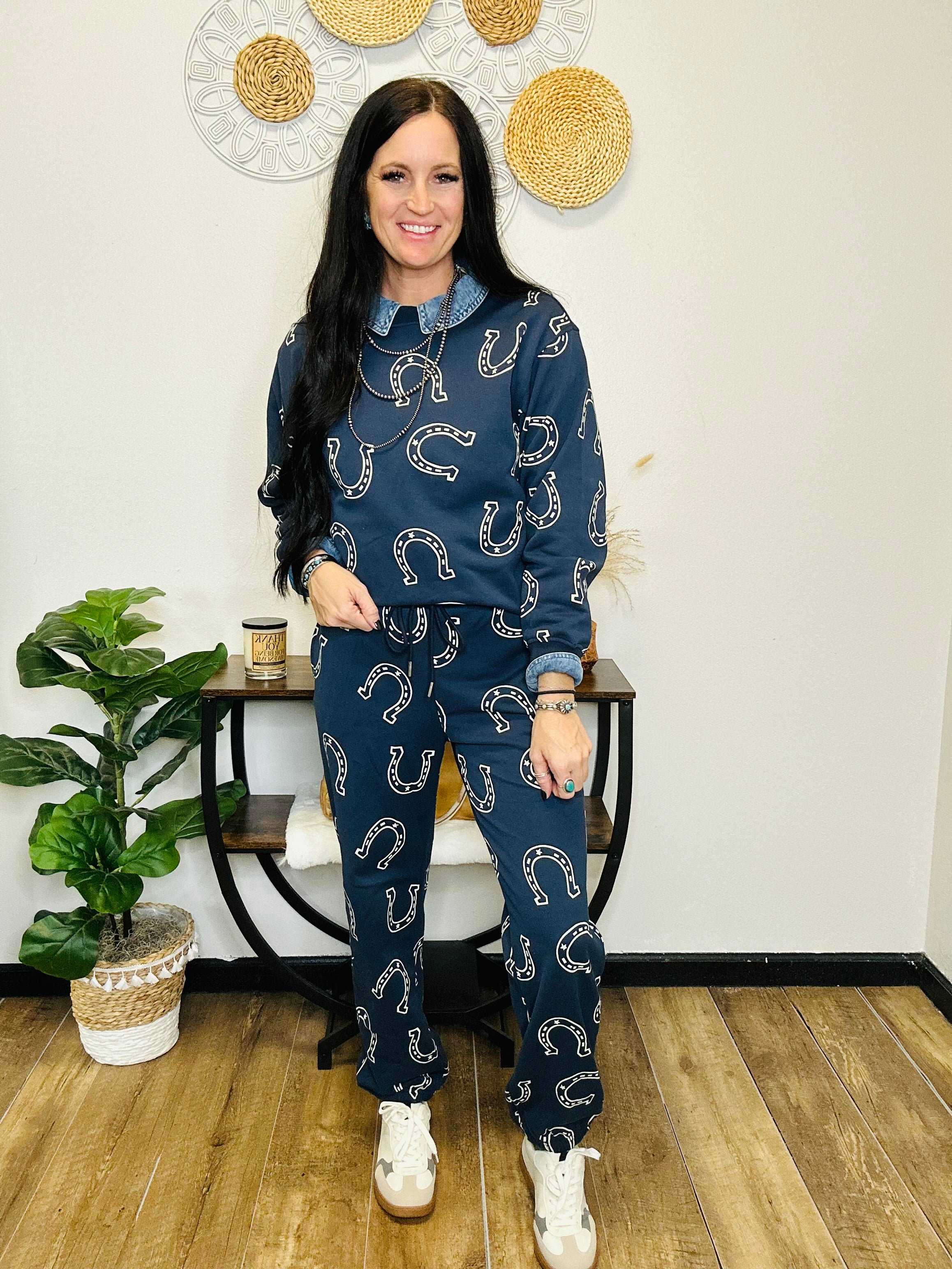 Women's Navy Horseshoe Print Sweat Set Long Sleeve Pullover with Jogger Style Bottoms