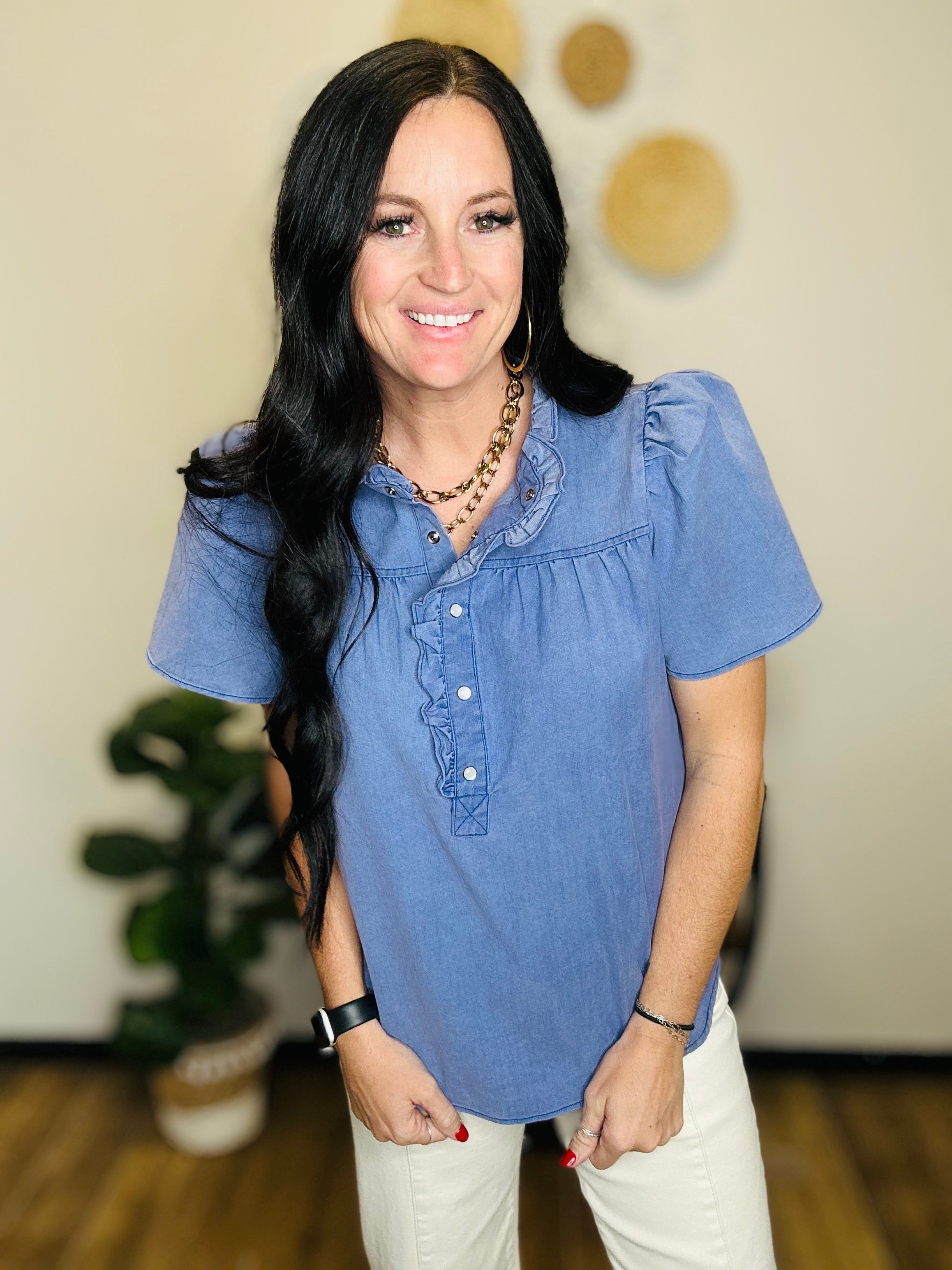 Women's Short Sleeve Half Button Front Ruffle Collar Chambray Washed Denim Top