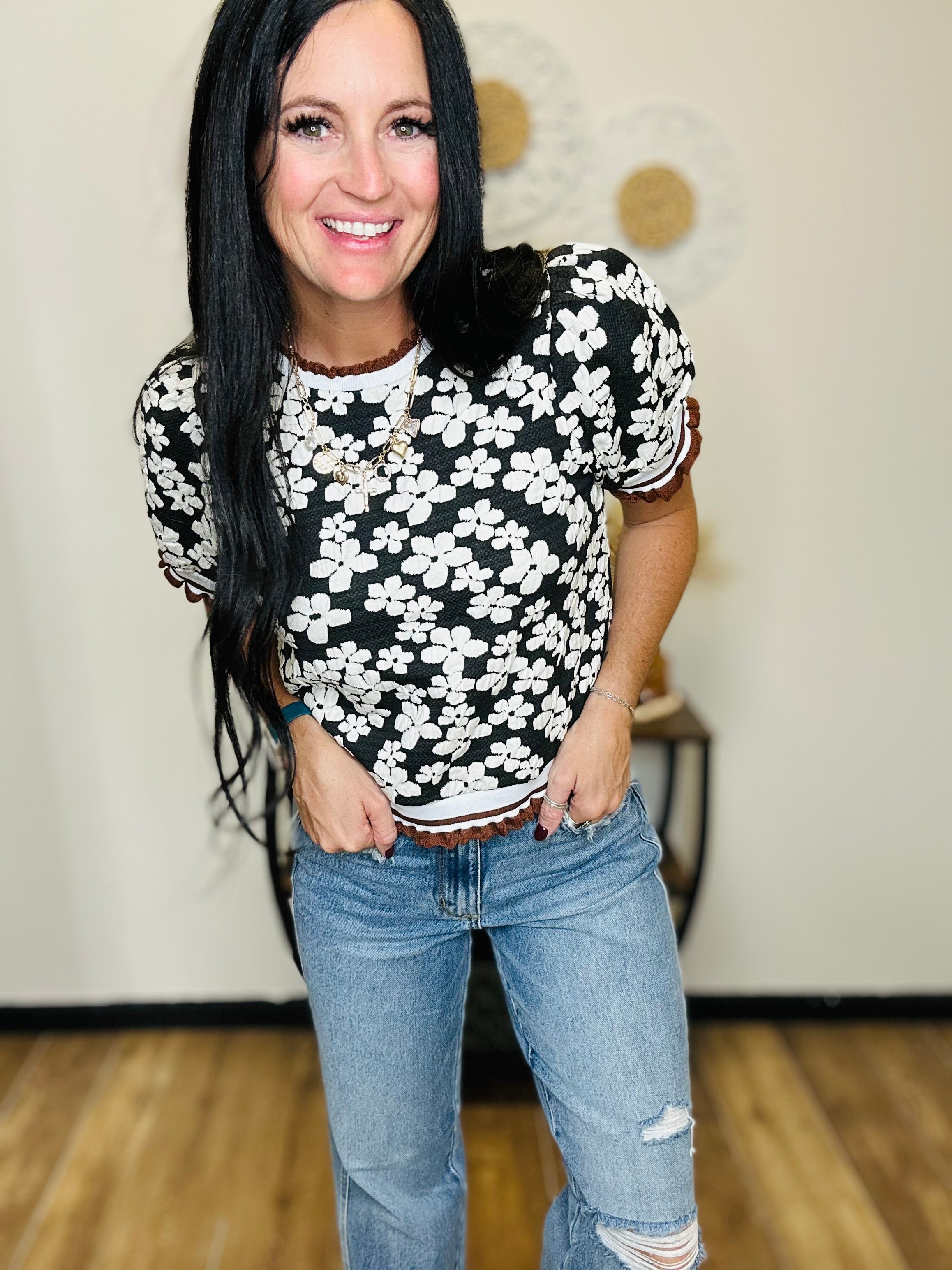 Nicole Embossed Flower Puff Sleeve Top in Black