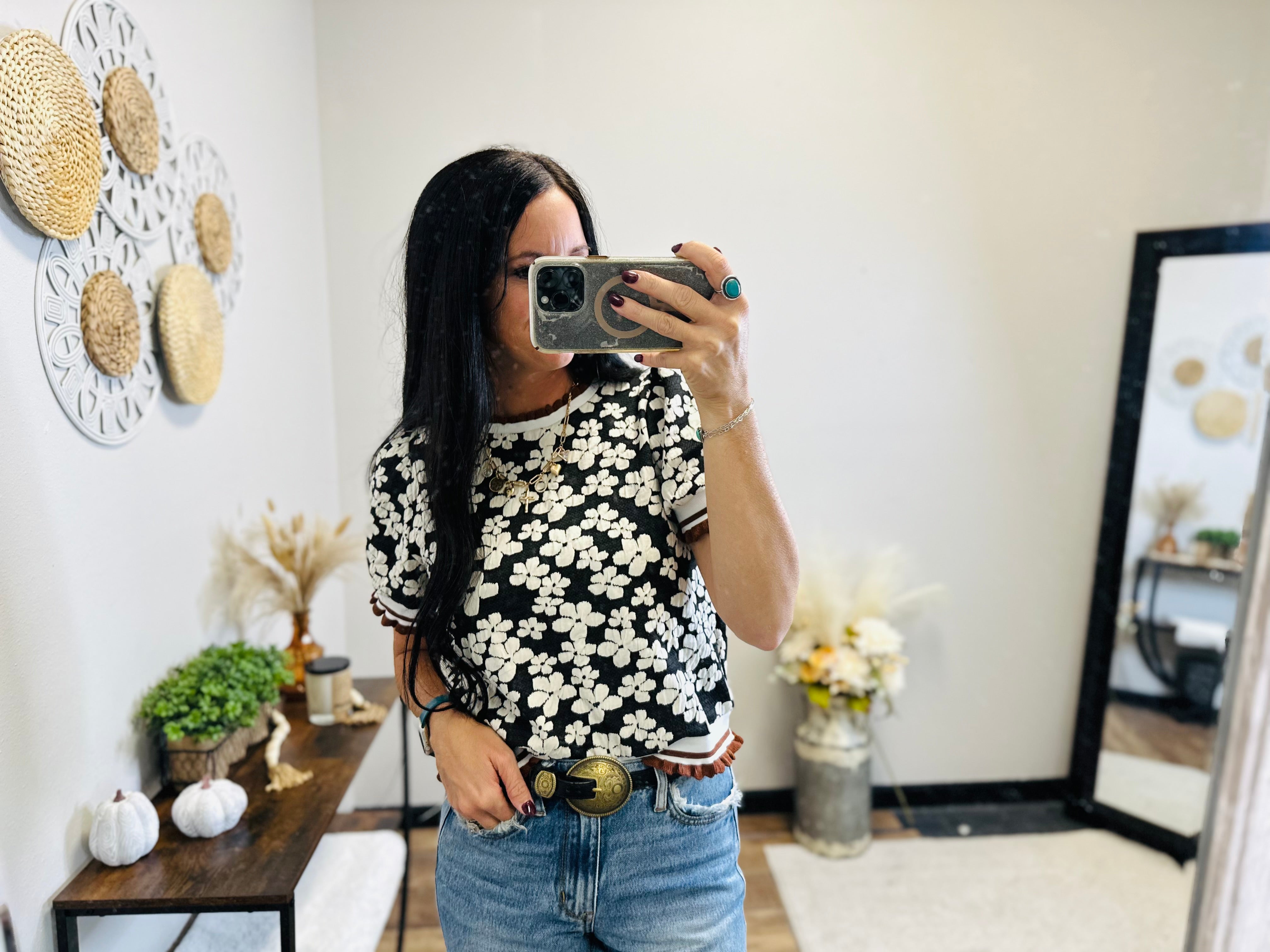 The Nicole Top is that perfect mix of feminine and fun — the one you’ll reach for when you want to feel effortlessly confident. With its soft knit texture and beautiful embossed floral design, this top adds just the right amount of detail without feeling fussy. The puff sleeves bring a touch of charm, while the ruffled contrast trim keeps it playful and unique — very Motis & Co.