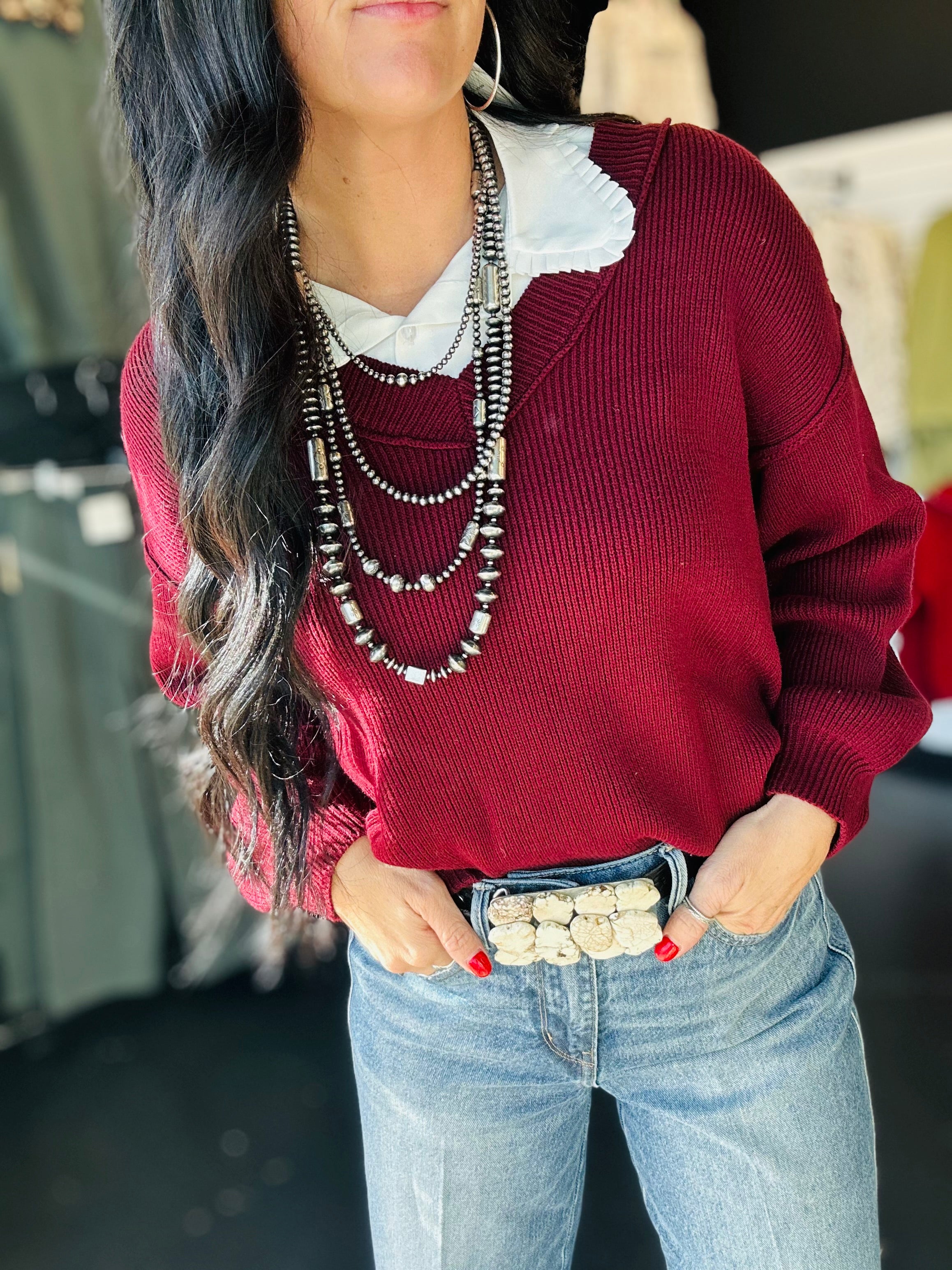 Women's Long Sleeve Oxblood Exposed Seam V Neck Knit Sweater