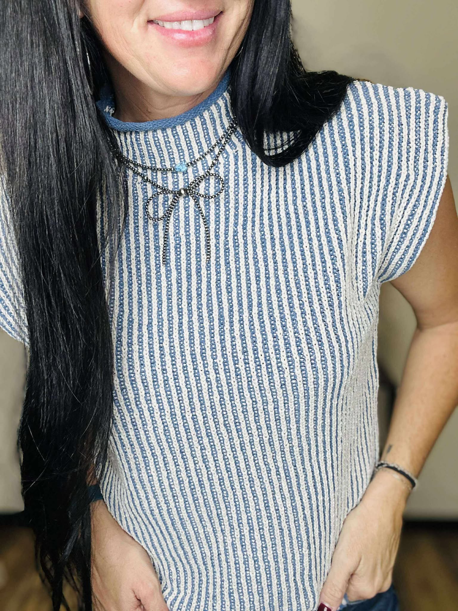 Meet your new layering favorite—the Finley Sweater Vest. Designed in a soft two-tone denim & white ribbed knit, this sleeveless mock neck vest brings a touch of modern sophistication to any outfit. Its structured yet cozy texture makes it perfect for styling over button-down shirts, long sleeves, or even a simple tee. Whether you’re dressing for the office or keeping it casual, this vest adds effortless polish to your look all season long.