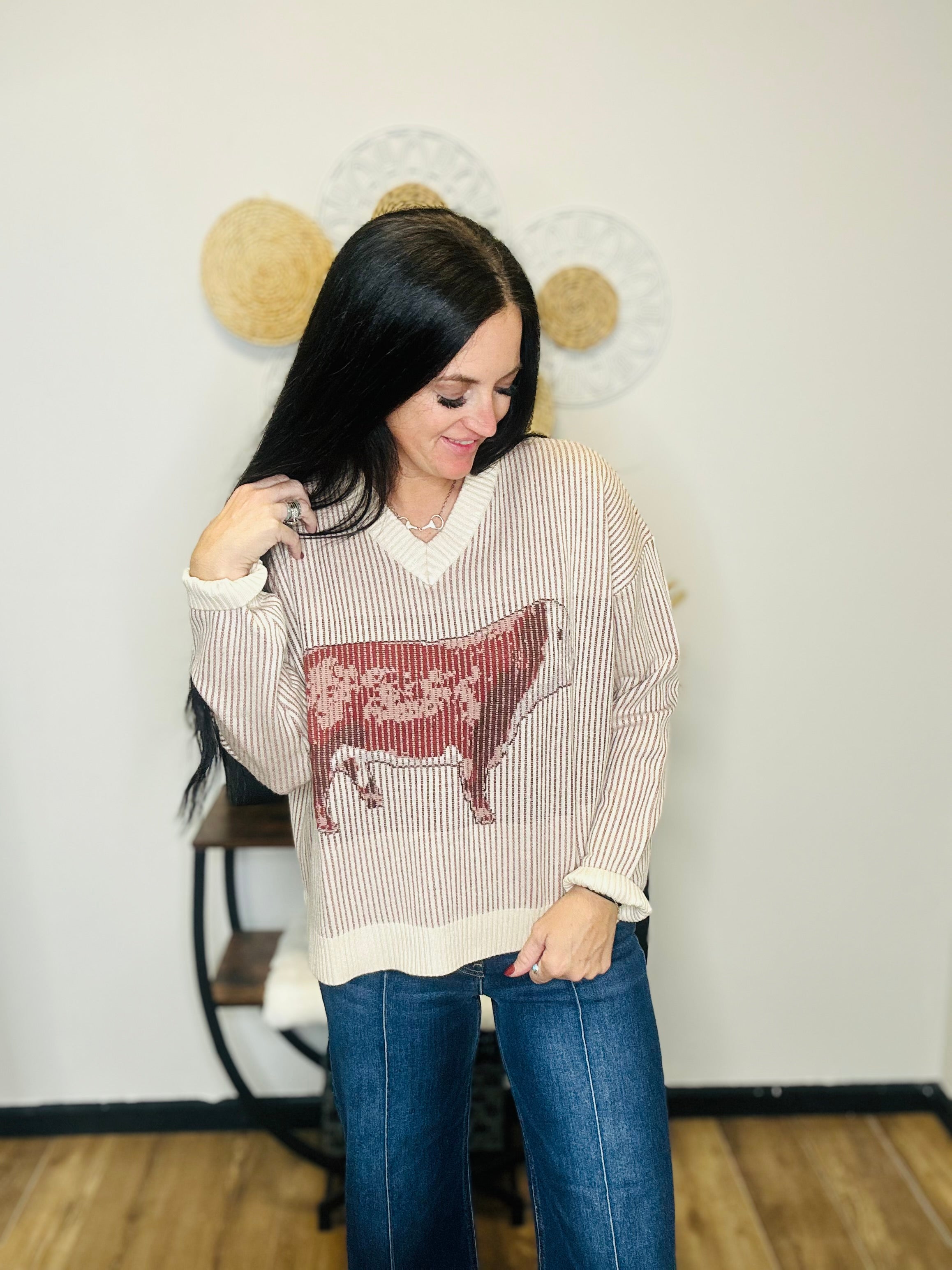 Women's Long Sleeve V Neck Western Herford Bull Sweater