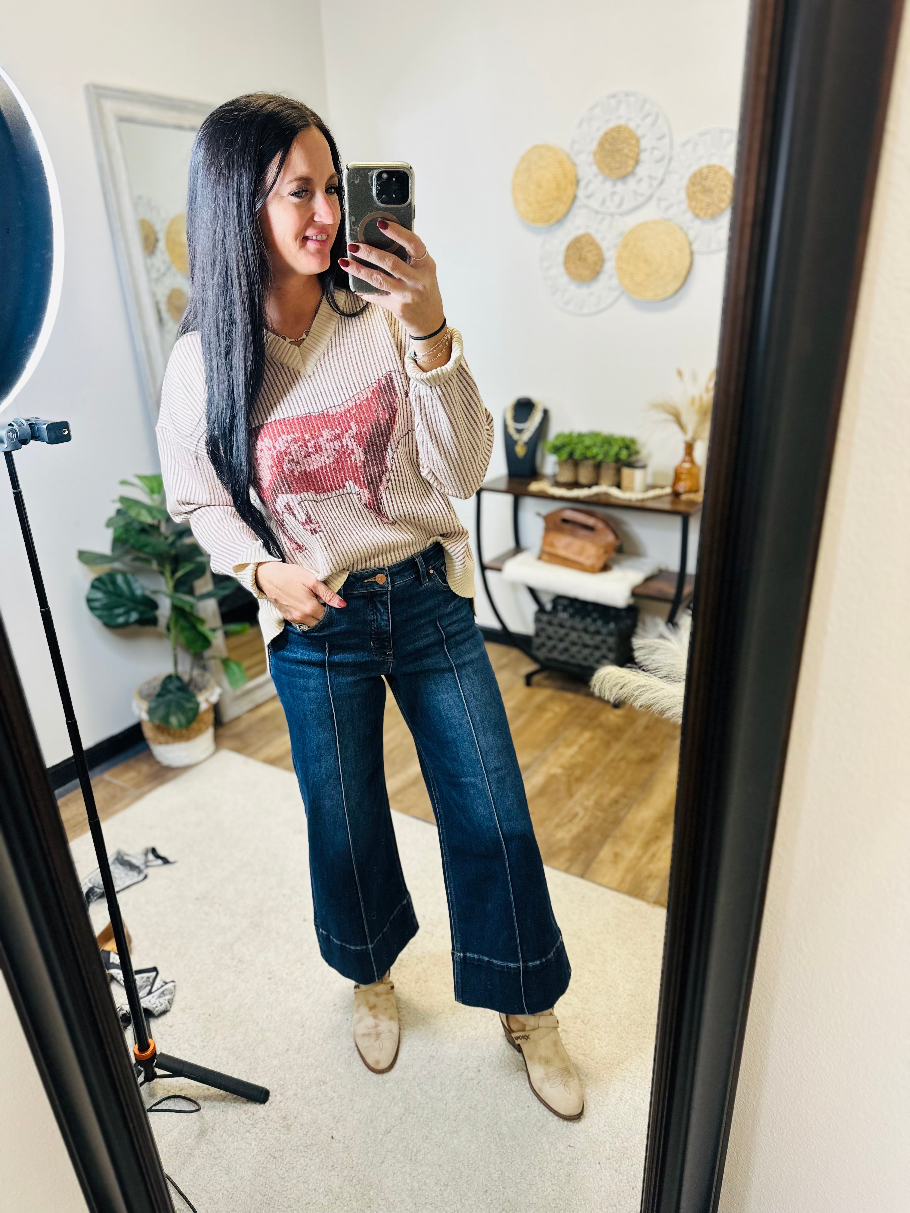 The Hereford Highway Sweater is western charm wrapped in cozy comfort. Featuring a bold Hereford bull design across the front, this one’s for the gals who love a little ranch-inspired style with a whole lot of softness. Made from a luxe ribbed knit with a relaxed fit, it’s perfect for chilly mornings, coffee runs, or evenings by the fire.
