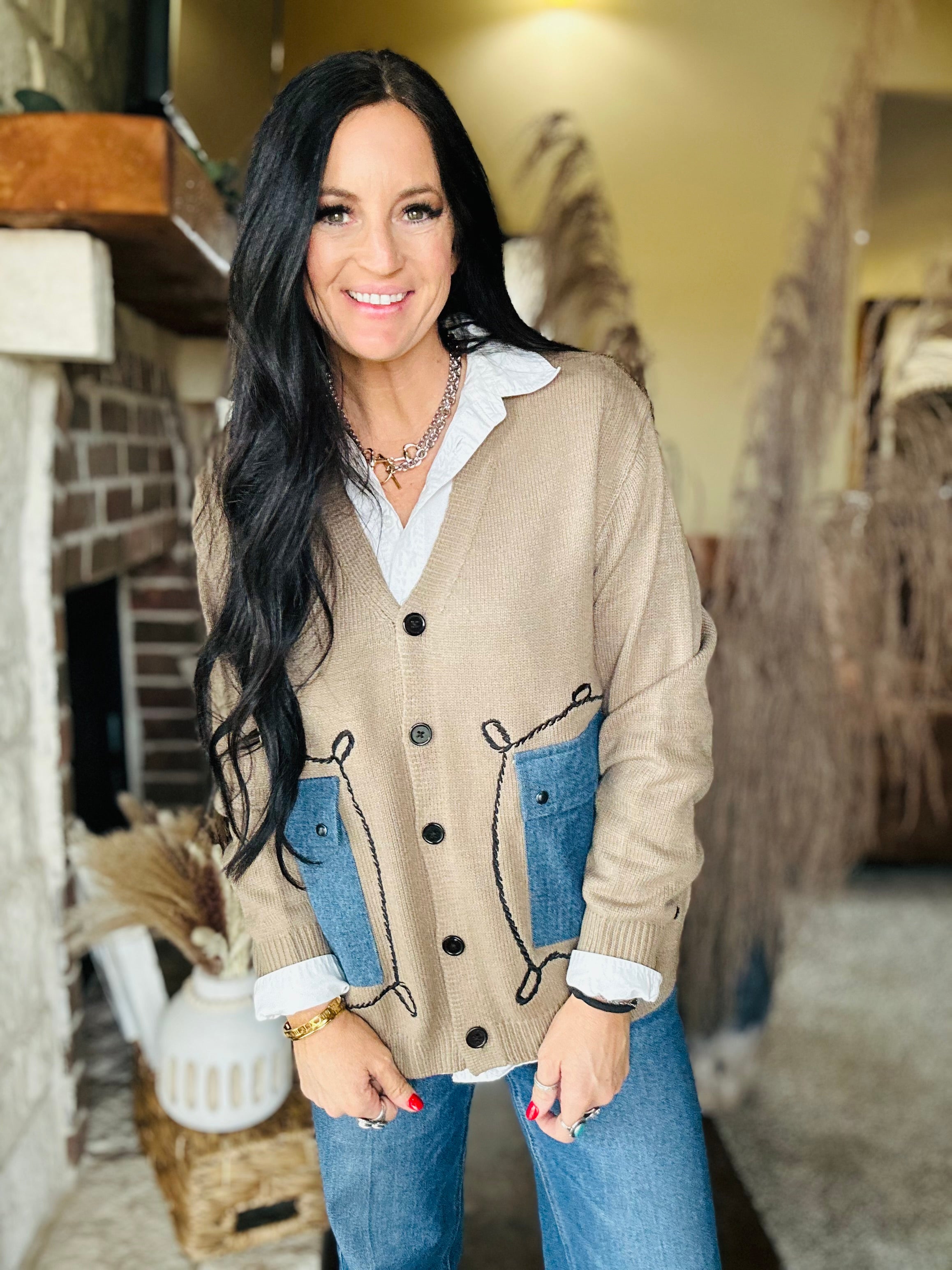 Women's Button Front Western Cardigan with Denim Patch Pockets and Herford Back Design