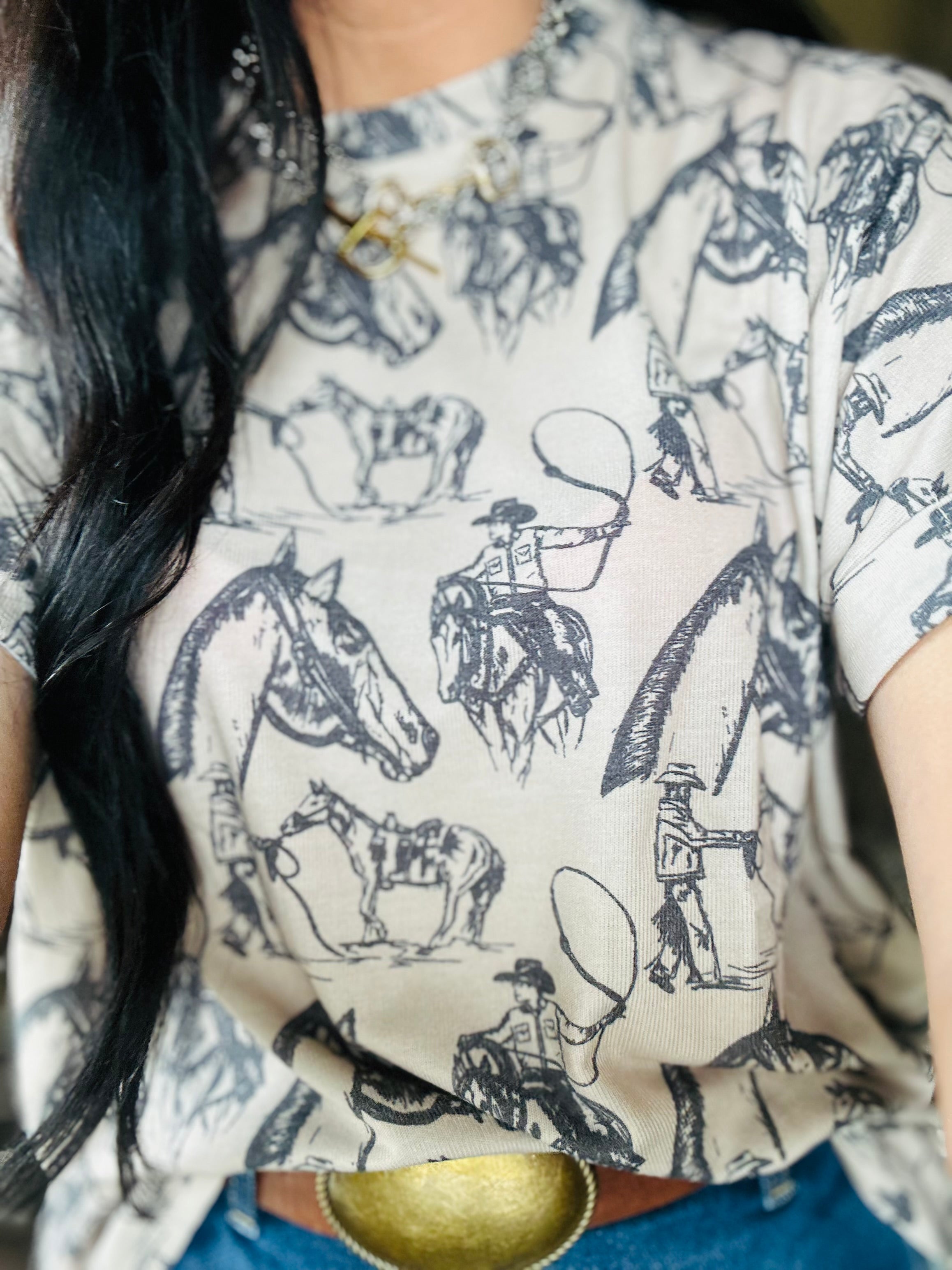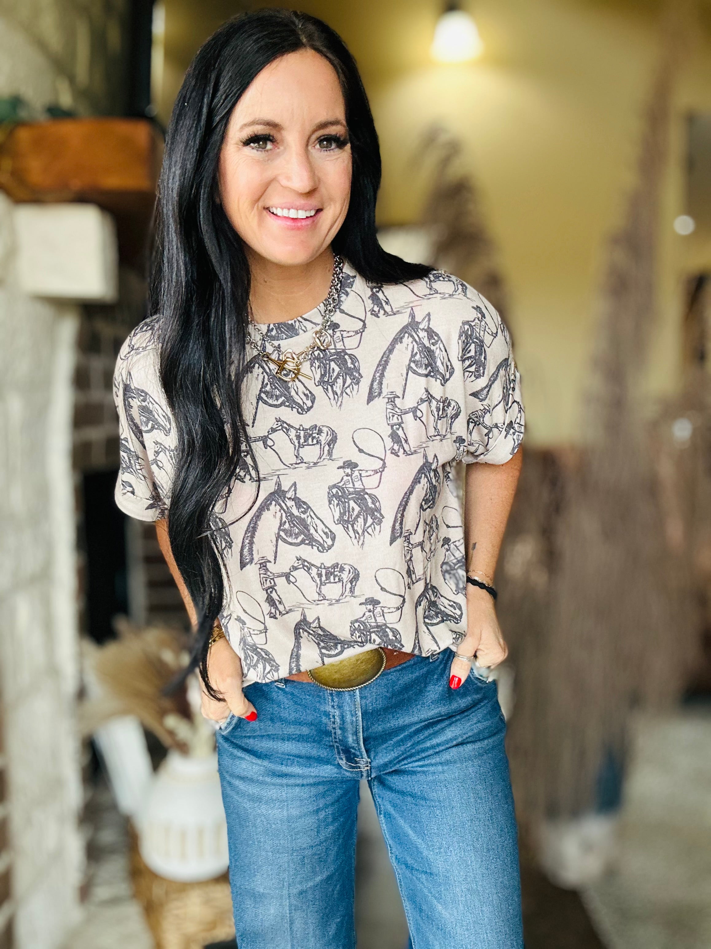 Women's Short Sleeve Relaxed Fit Western Horse Print Top