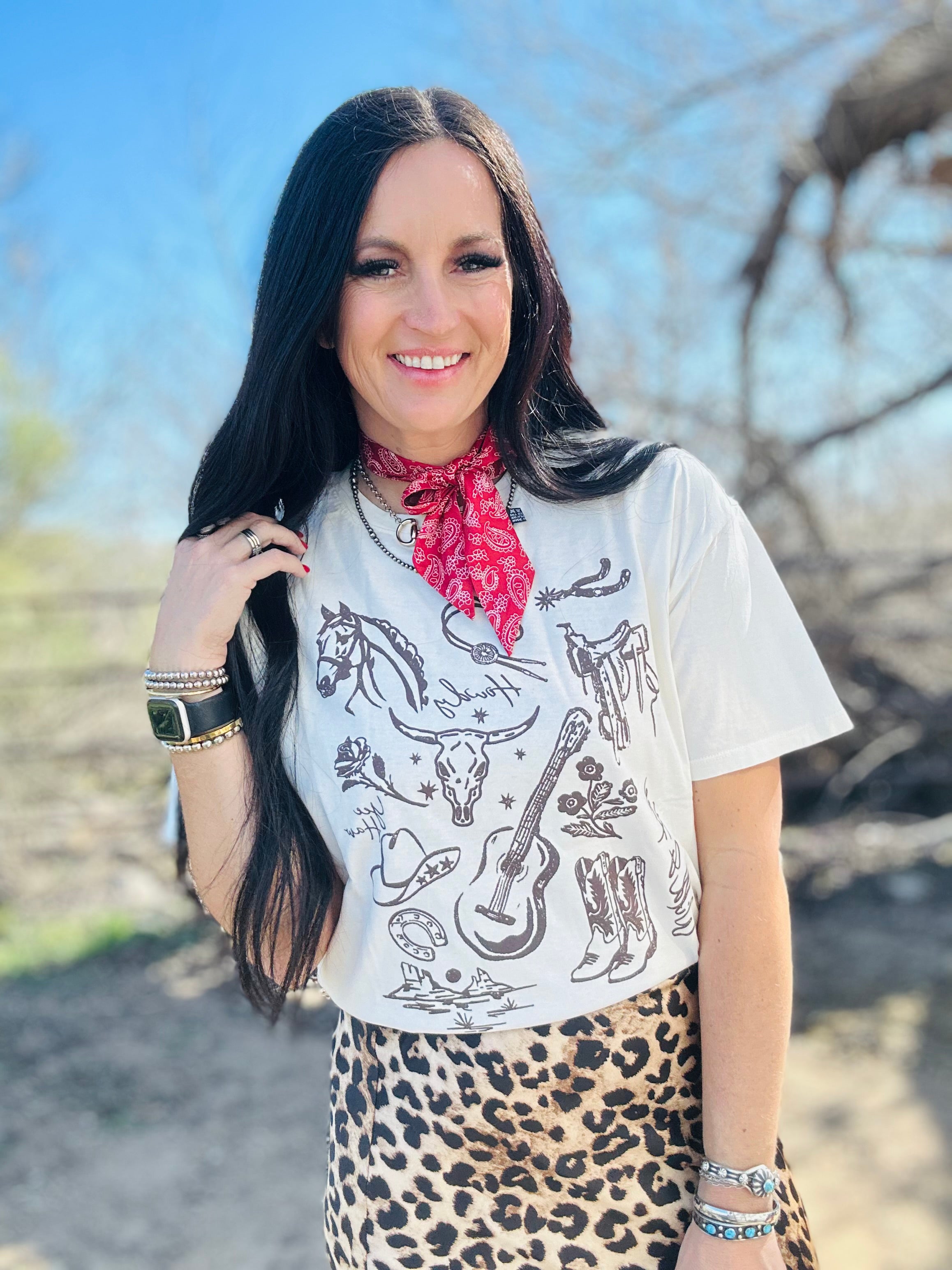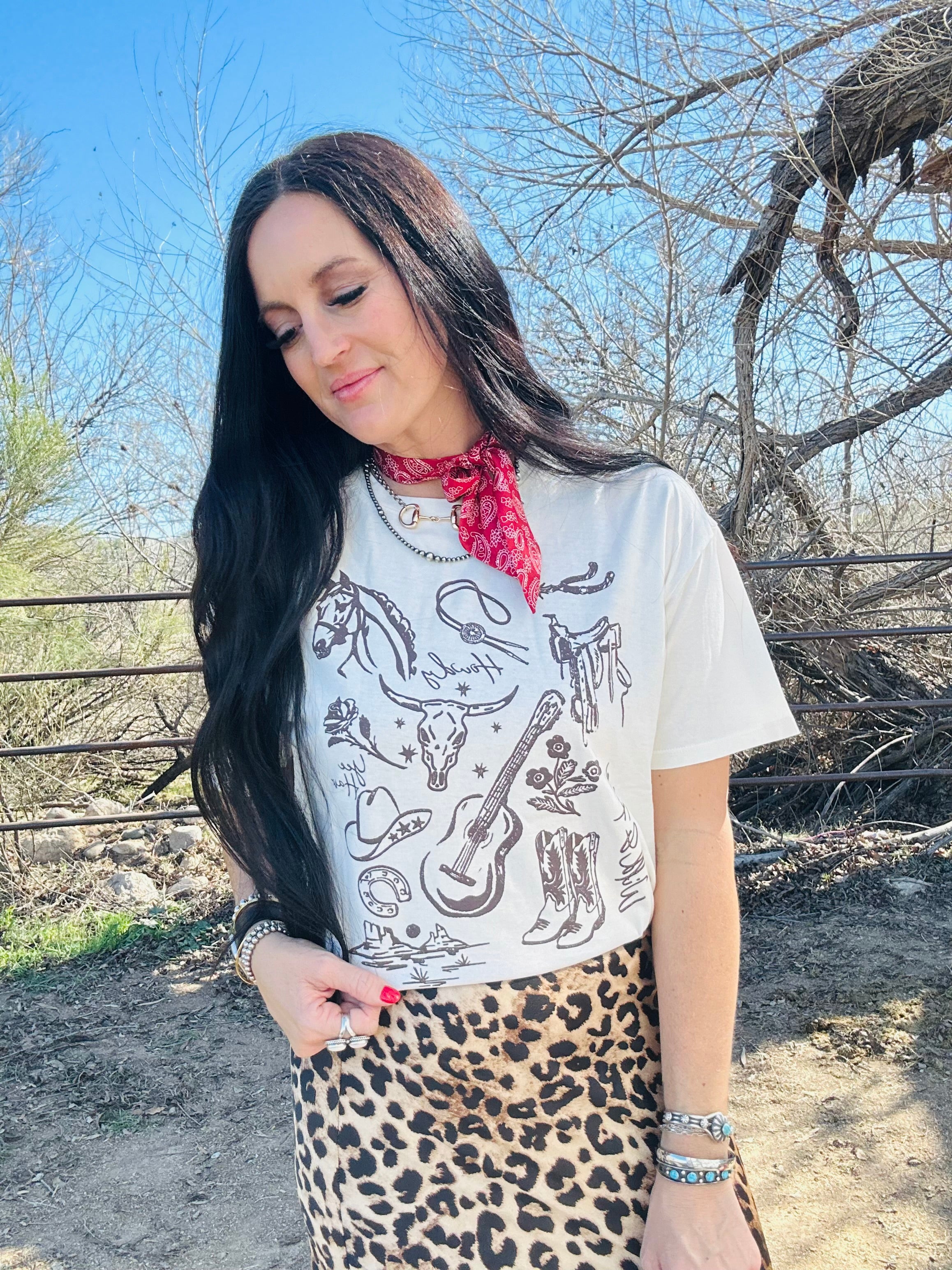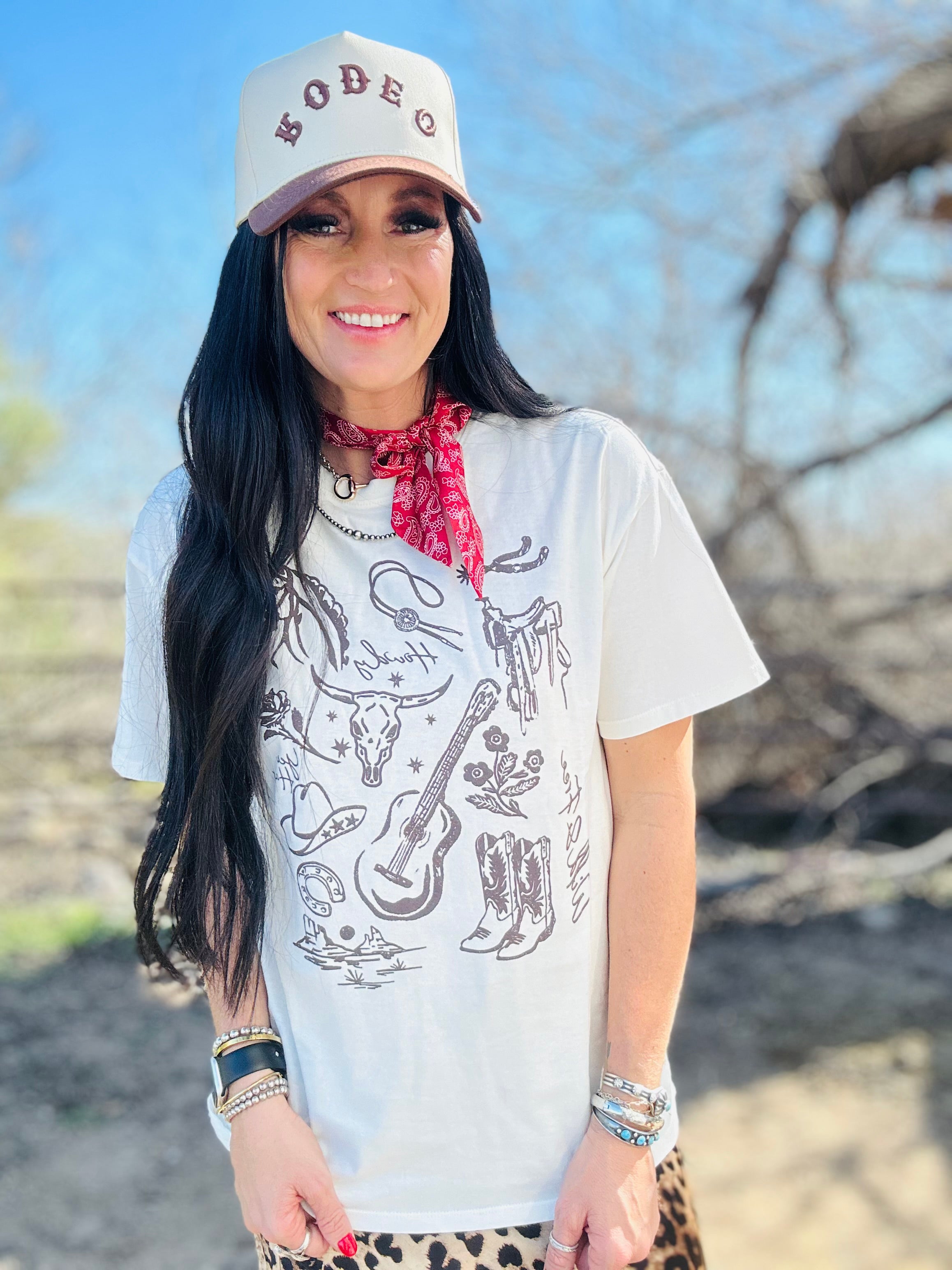 This tee is pure western soul in the easiest, everyday form. The Calla Country Girl Western Graphic Tee features a hand-drawn sketch-style graphic with all the country details we love — horses, boots, western icons, and that laid-back cowgirl vibe. It feels timeless, not trendy, and instantly gives your outfit personality without trying too hard.
