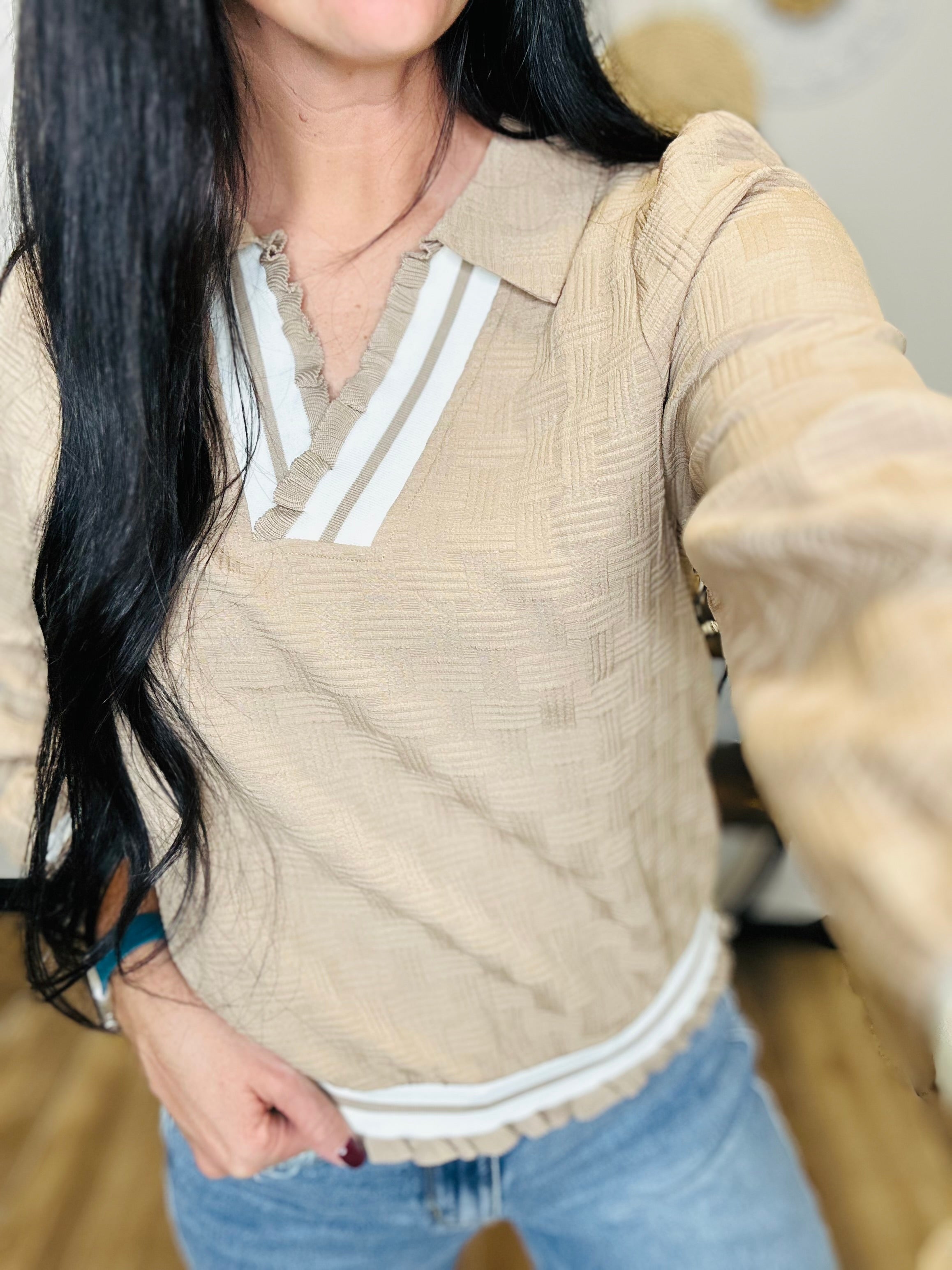 Polished yet playful, the Evie Textured Pullover Blouse is made to elevate your everyday style. Designed with a soft woven texture and a flattering V-neckline, this long sleeve blouse features a collared neckline and charming ruffled contrast stripe detailing for a modern twist. The relaxed fit and lightweight feel make it easy to dress up or down—perfect for work, brunch, or weekend plans. Pair it with denim for casual chic or tailored pants for a refined look.