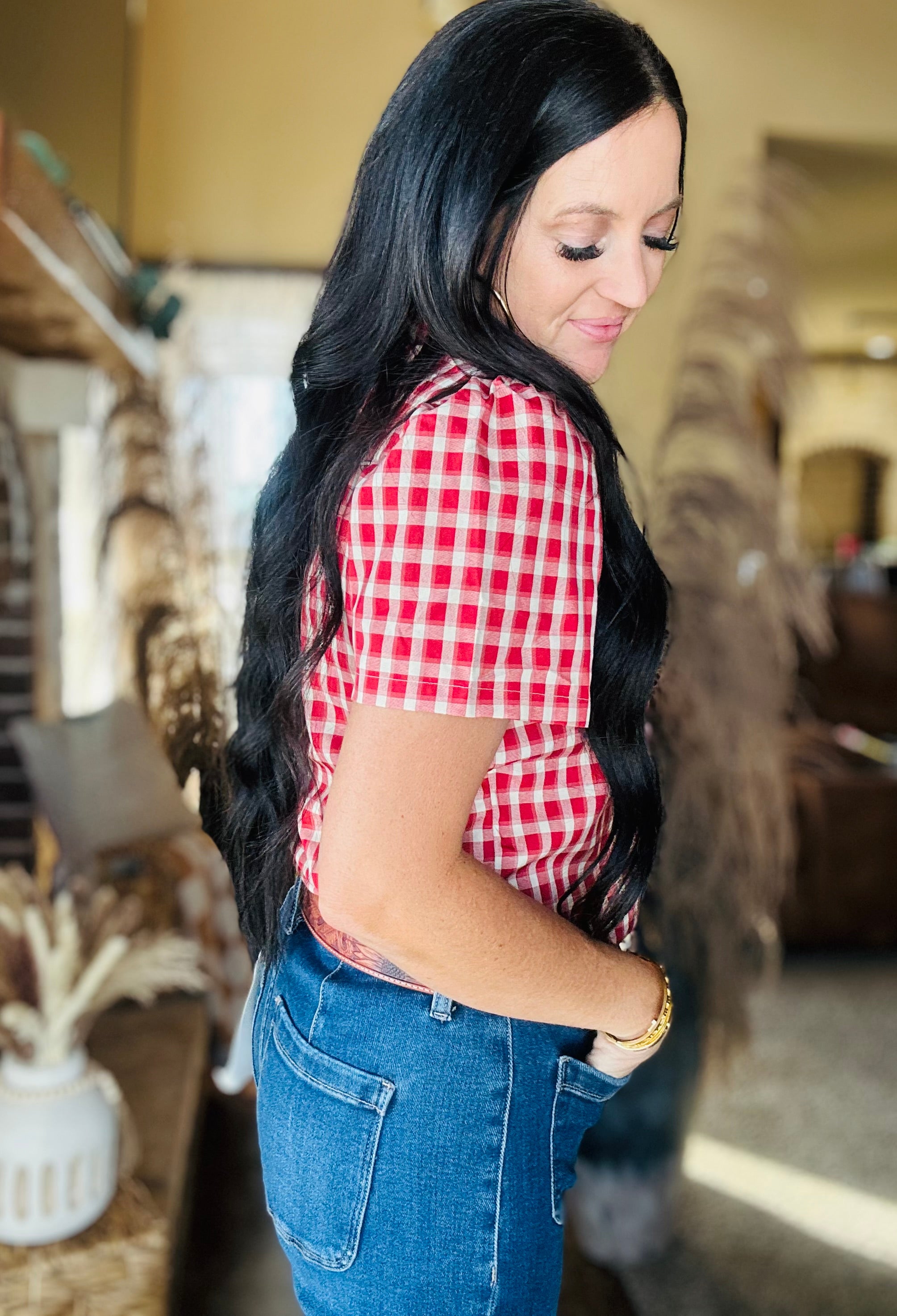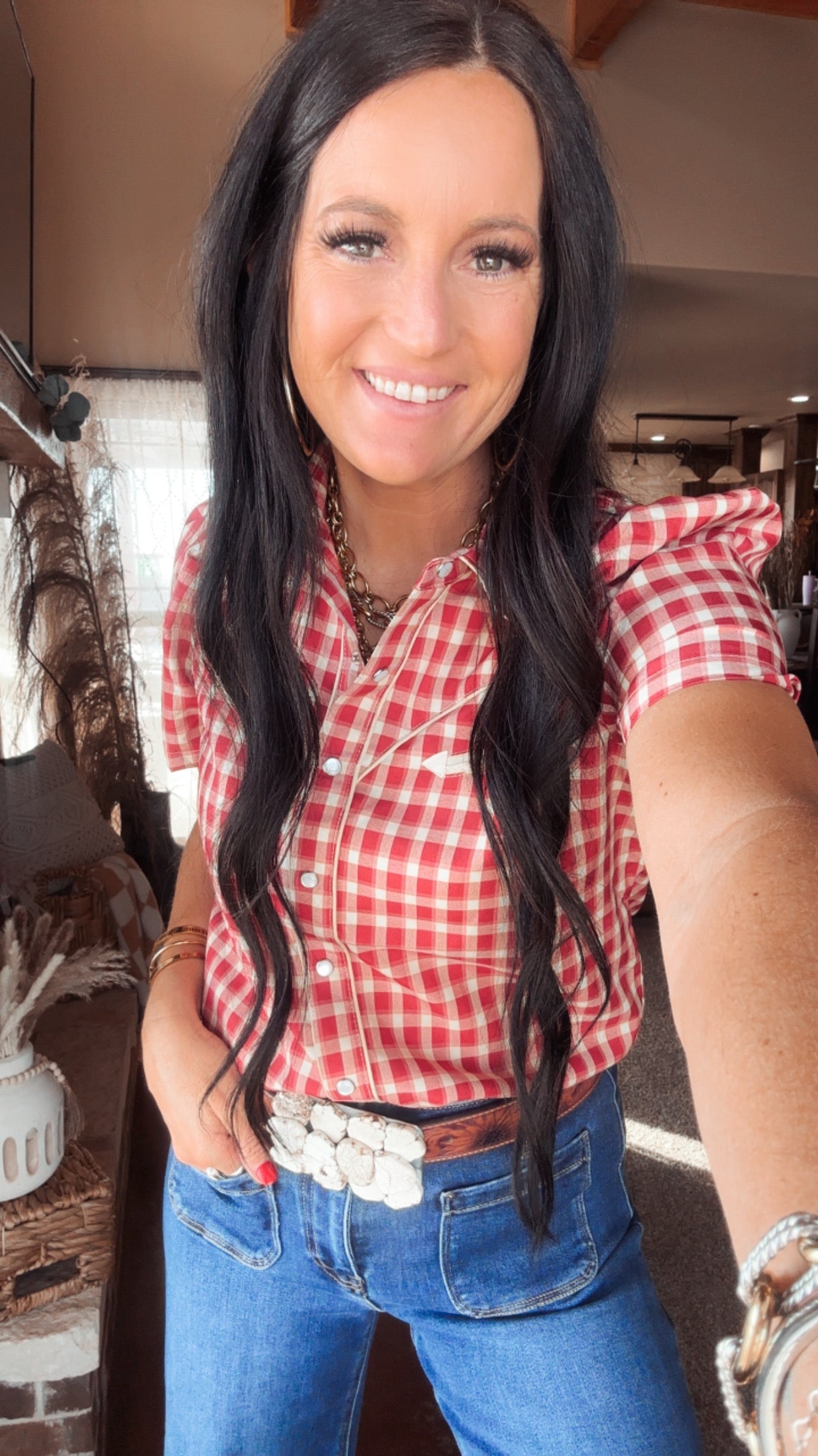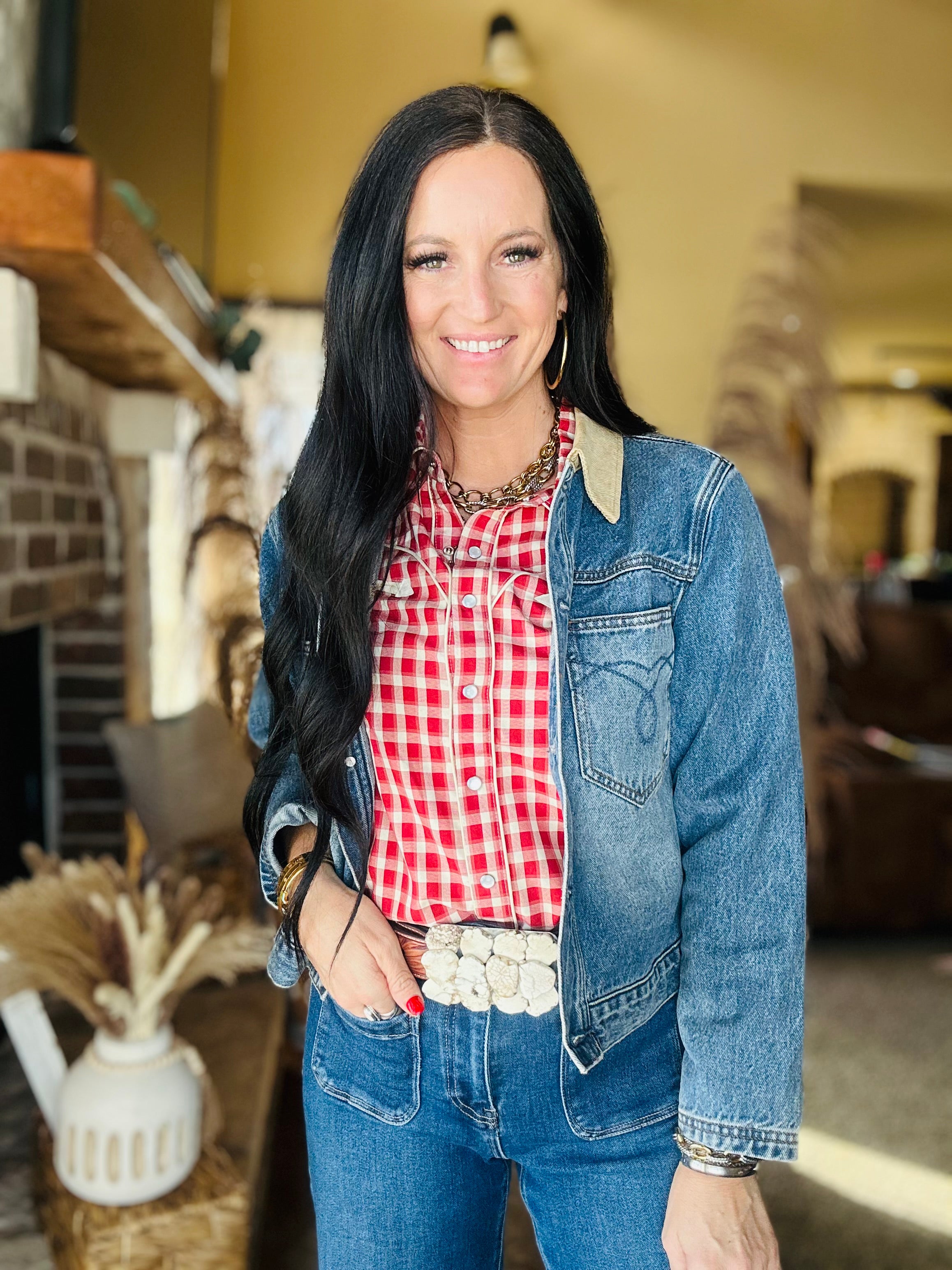 A true wardrobe staple—and a favorite for very good reason. The Ginger Red Plaid Western Blouse is one of those pieces that just works with everything. The classic red gingham print paired with pearl snaps gives you that timeless western look that never goes out of style.