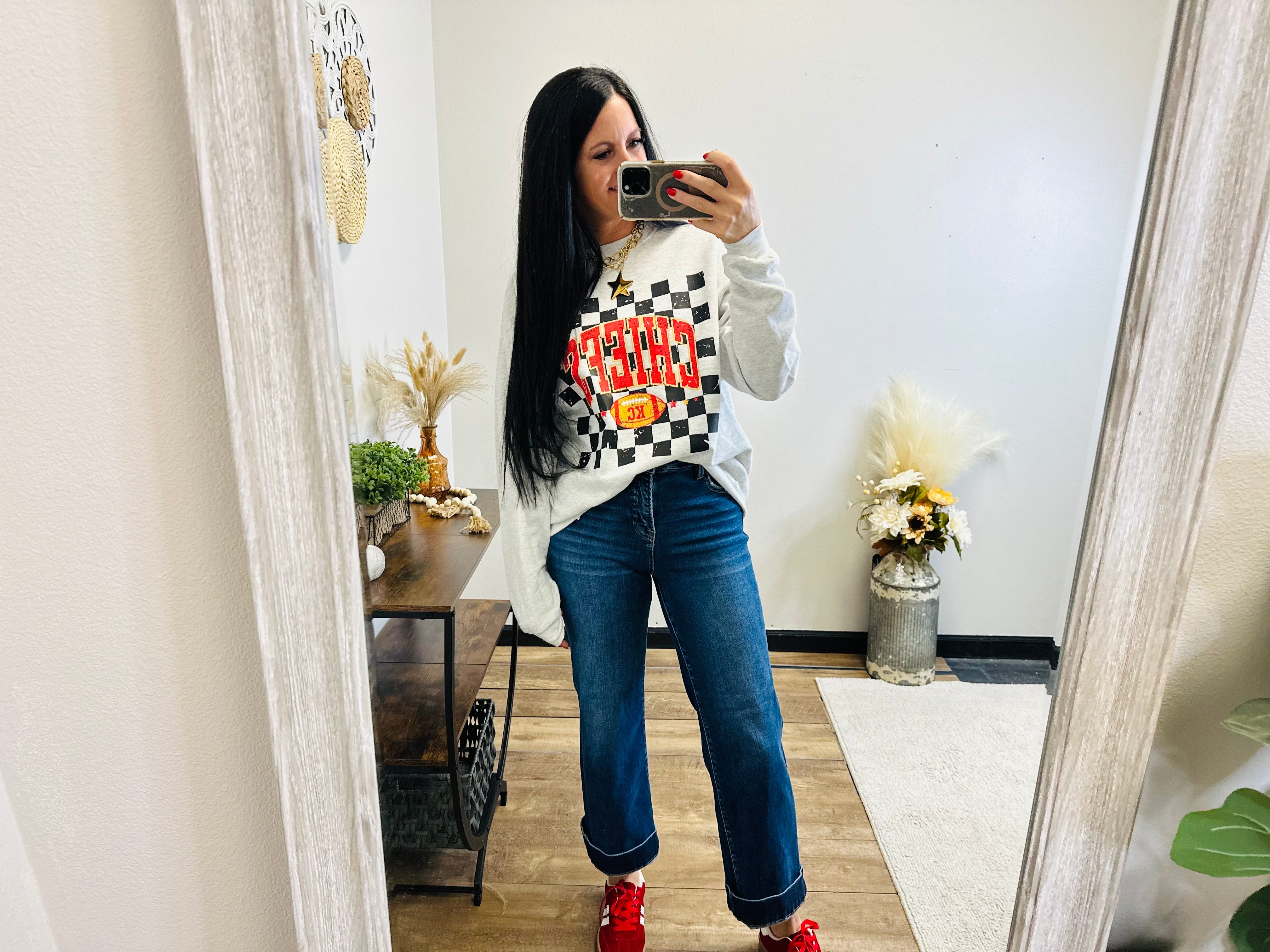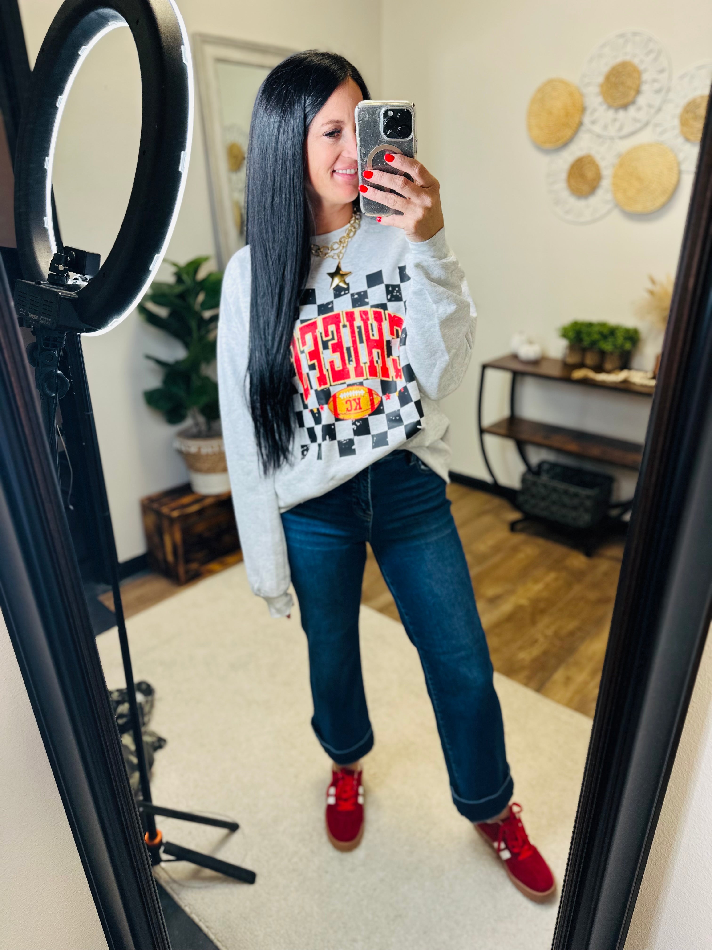 Game day just got a whole lot cuter! Our KC Football Checkered Sweatshirt is the perfect way to cheer on your team in comfort and style. Featuring a bold checkered football graphic front and center, this cozy gray sweatshirt has that relaxed, true-to-size fit you’ll love. Want the oversized look? Just size up for that effortless, laid-back vibe.