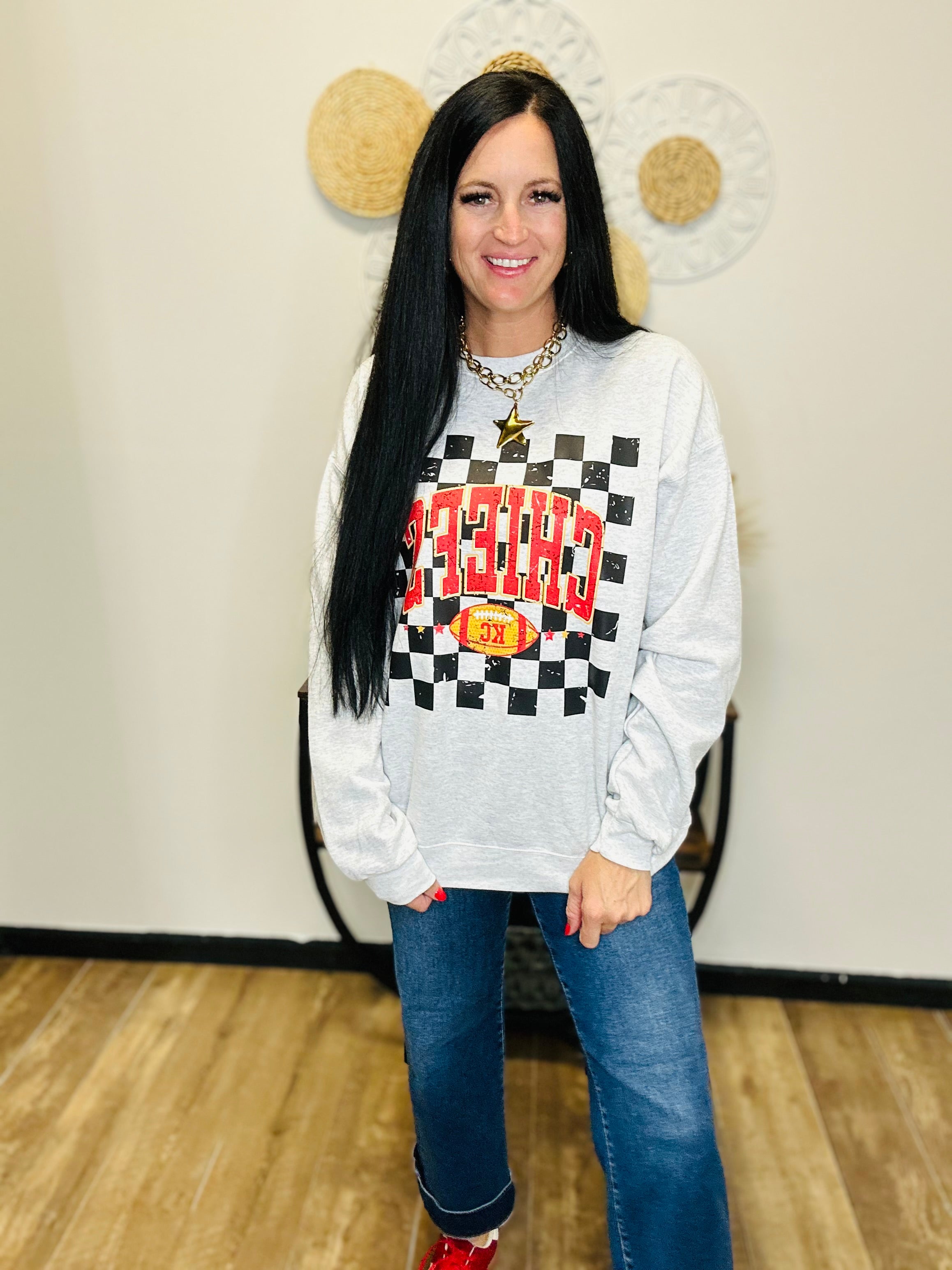 Long Sleeve Chiefs Checkered Gray KC Football Sweatshirt