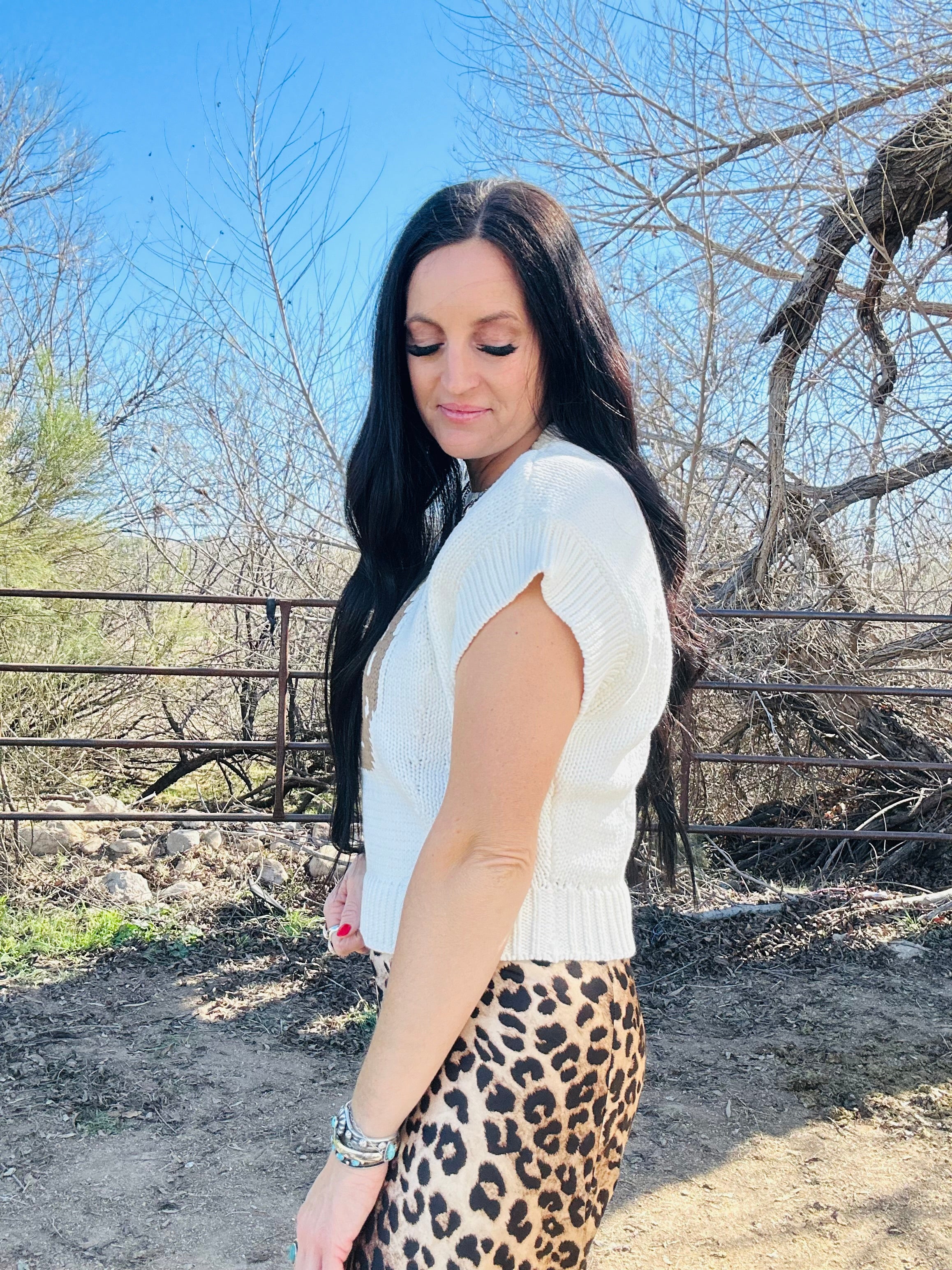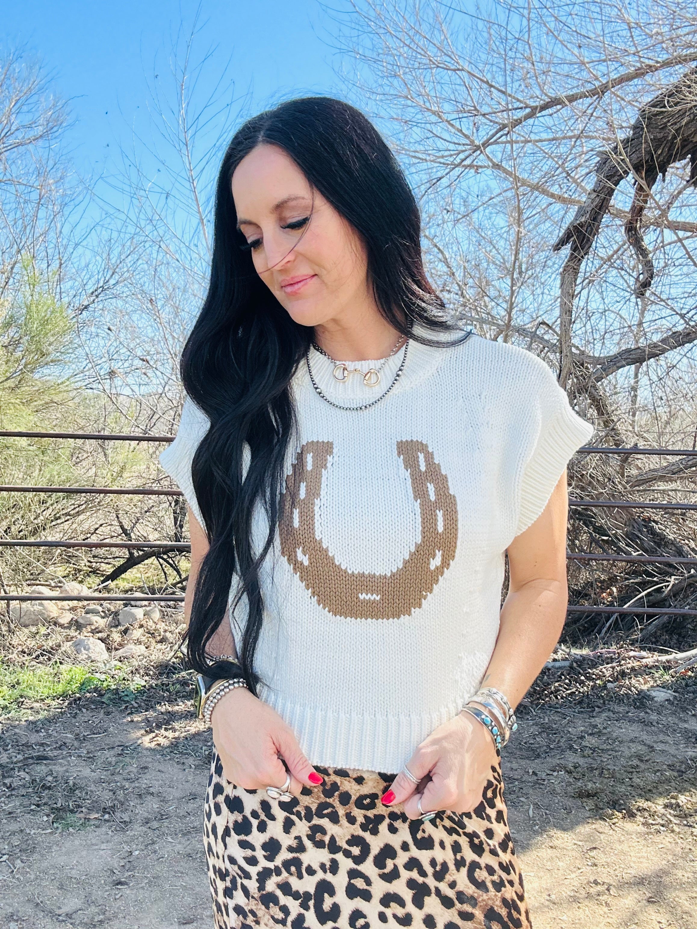 This is one of those pieces that instantly makes an outfit feel styled. The Hadley Horseshoe Sweater Vest features a classic western horseshoe design on a soft cream knit that’s easy, timeless, and full of charm. With its relaxed drop-shoulder fit and short sleeves, it’s the perfect in-between piece when you want something cozy but not heavy.