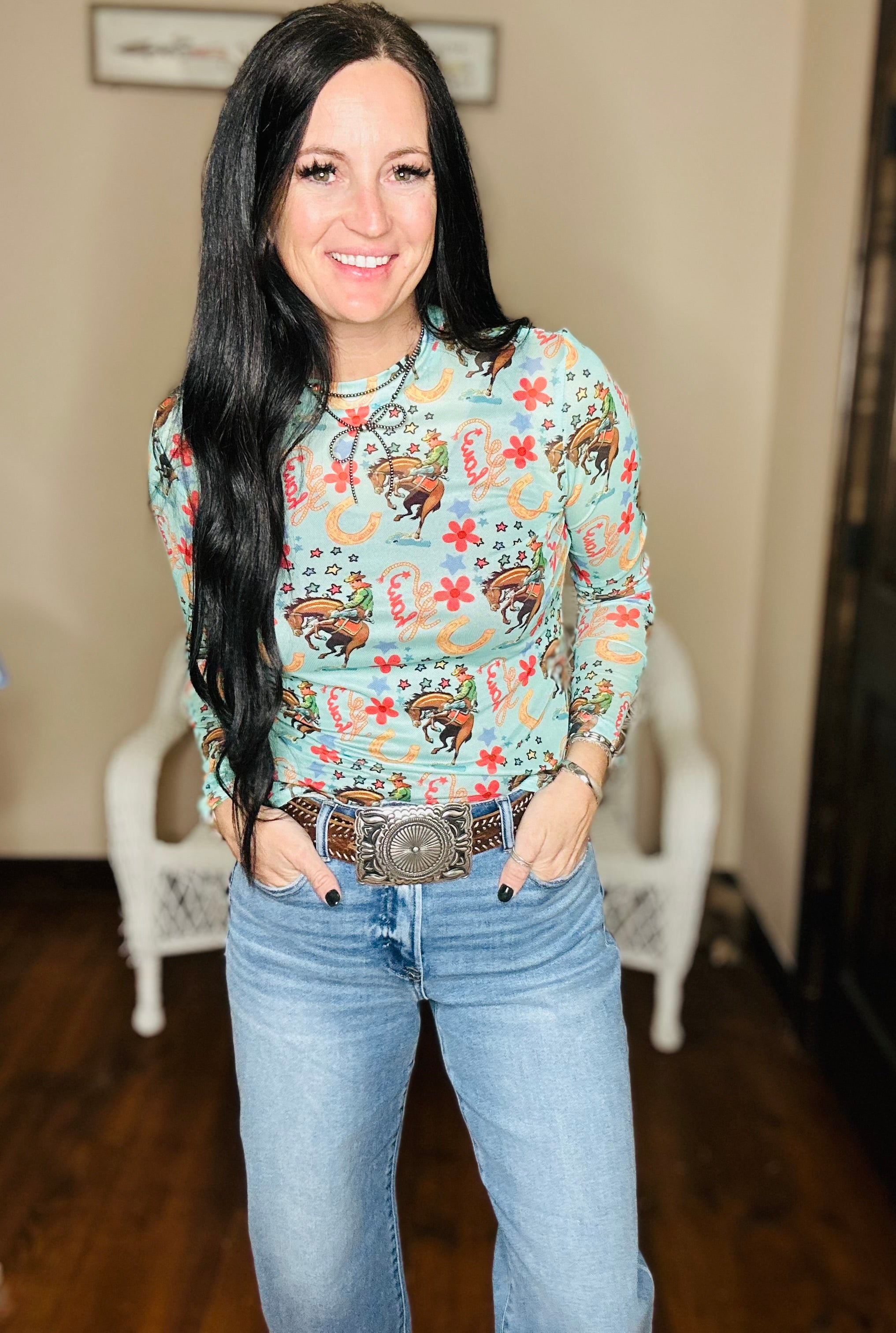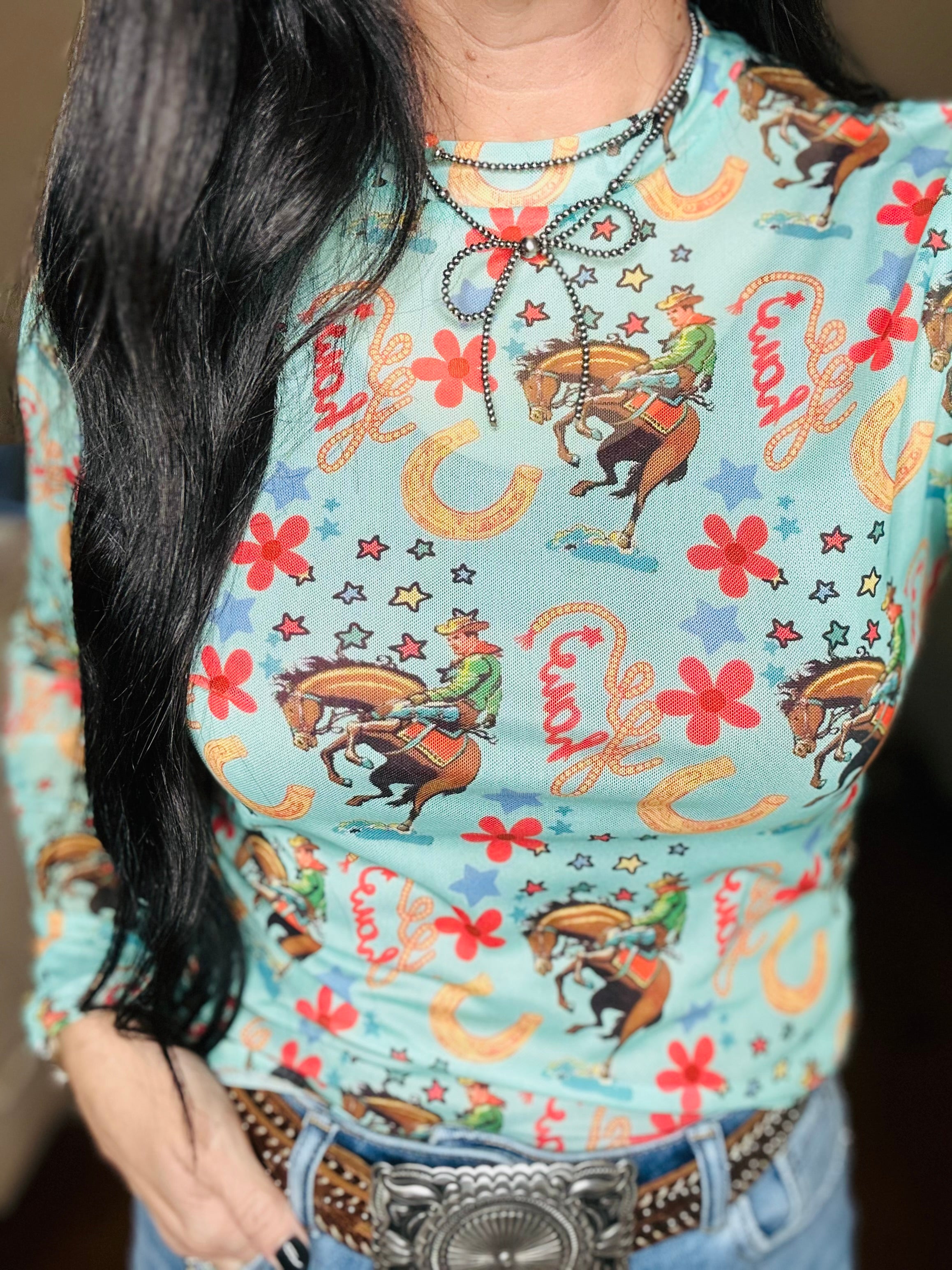 Women's Long Sleeve Sheer Teal Western Rodeo Print Mesh Layering Top