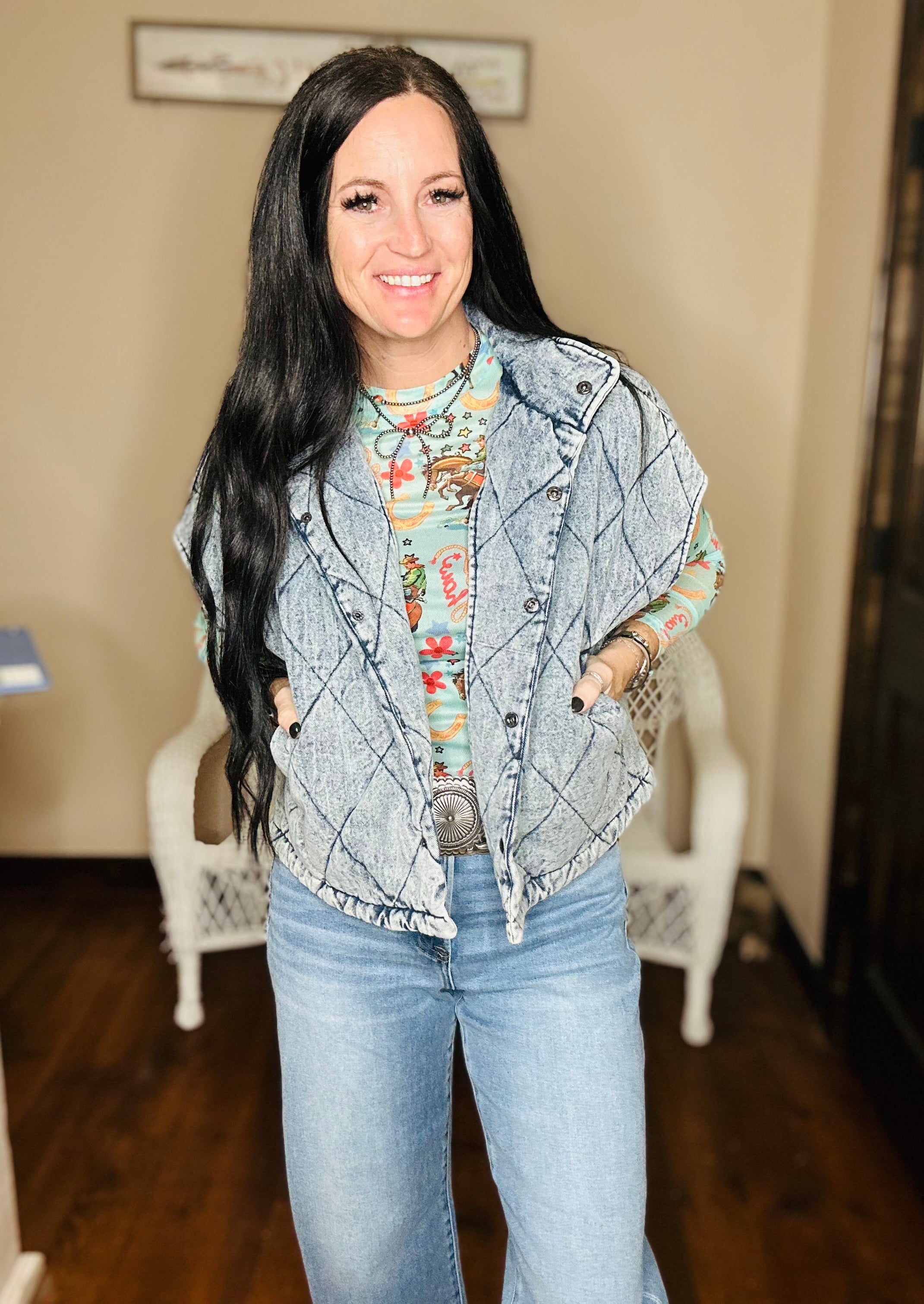 The Howdy Cowboy Top brings all the vintage western vibes in the most fun and flattering way! With its retro cowboy print, playful “Howdy” lettering, and soft teal base, this sheer mesh top is made to turn heads — whether you layer it under a graphic tee, pair it with denim and boots, or style it solo for a bold statement look.
