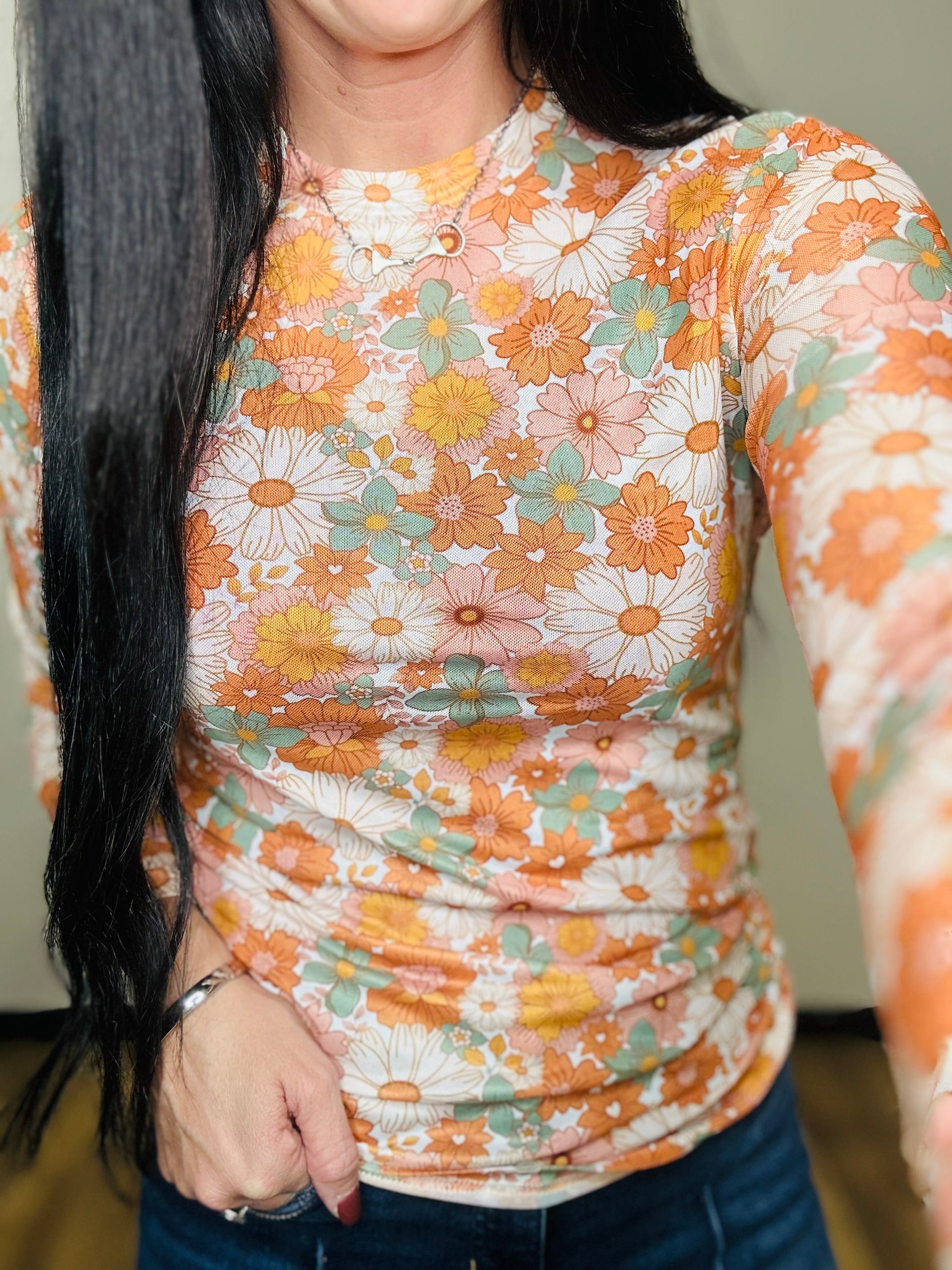 The Ria Mesh Top is giving major vintage boho vibes with its dreamy teal and orange floral print — the perfect blend of soft and statement. Made from lightweight, sheer stretch mesh, it’s the kind of top that layers beautifully under your favorite overalls, shackets, or graphic tees while adding just the right touch of fall color and personality.