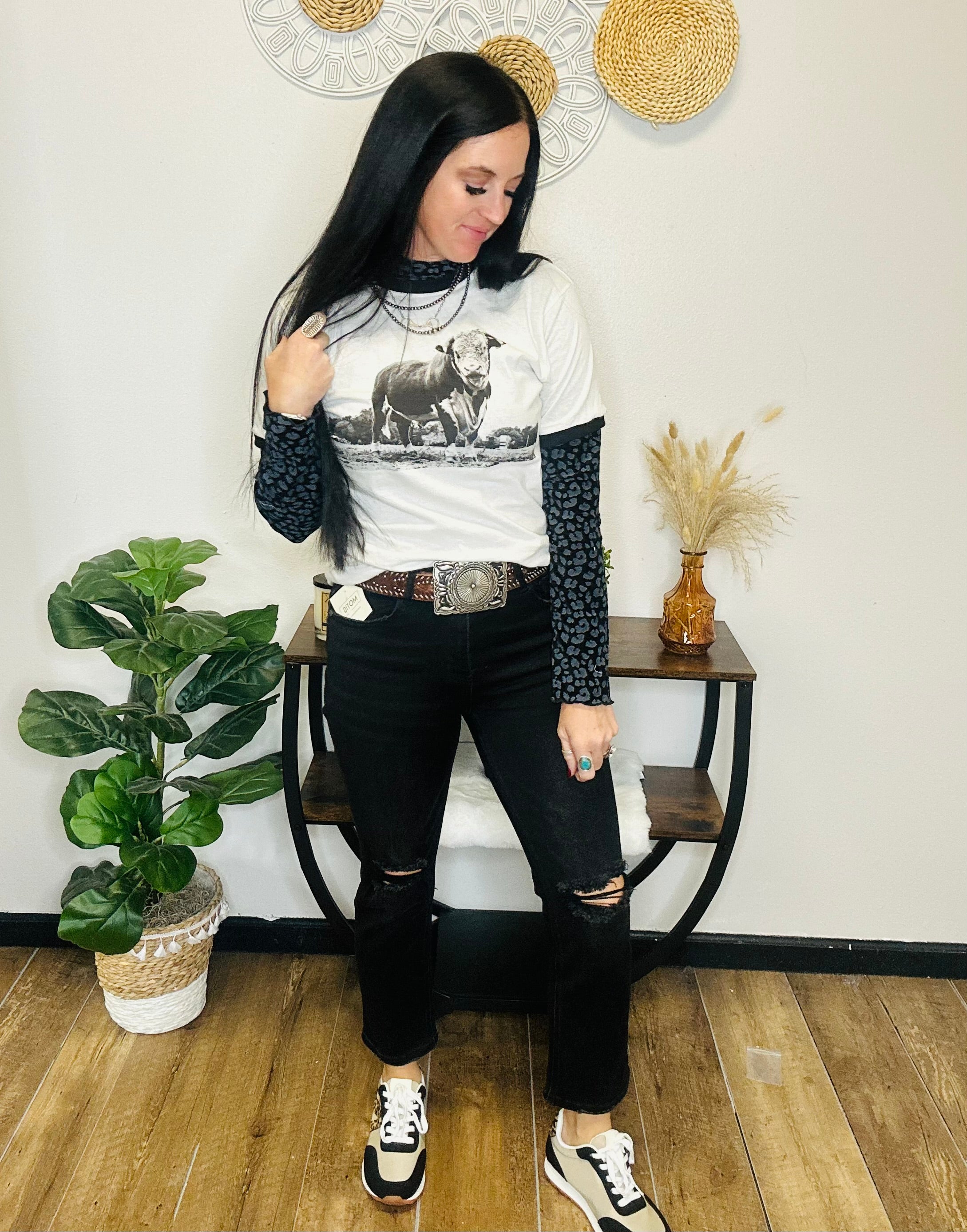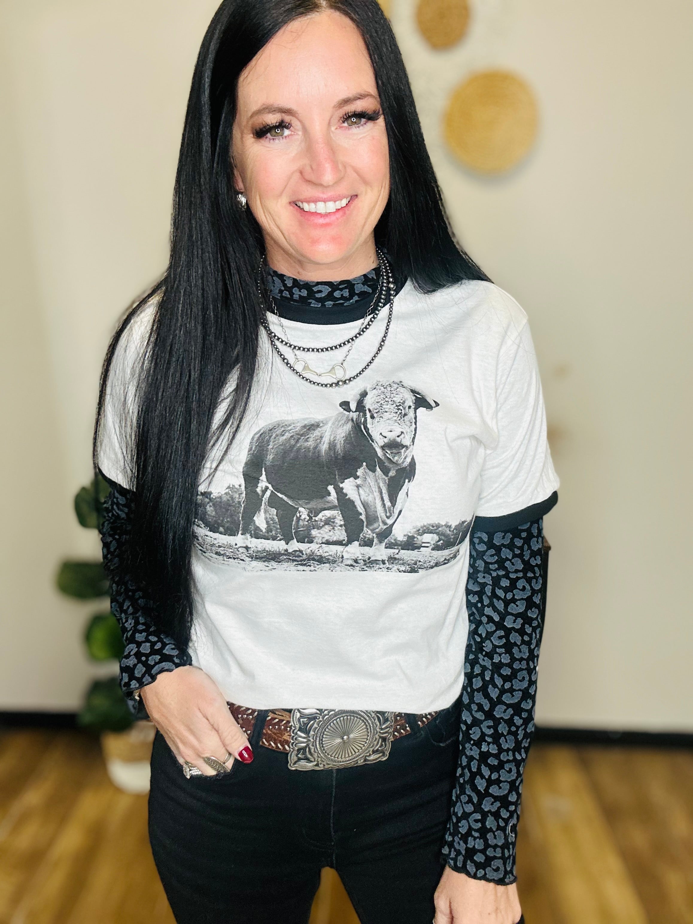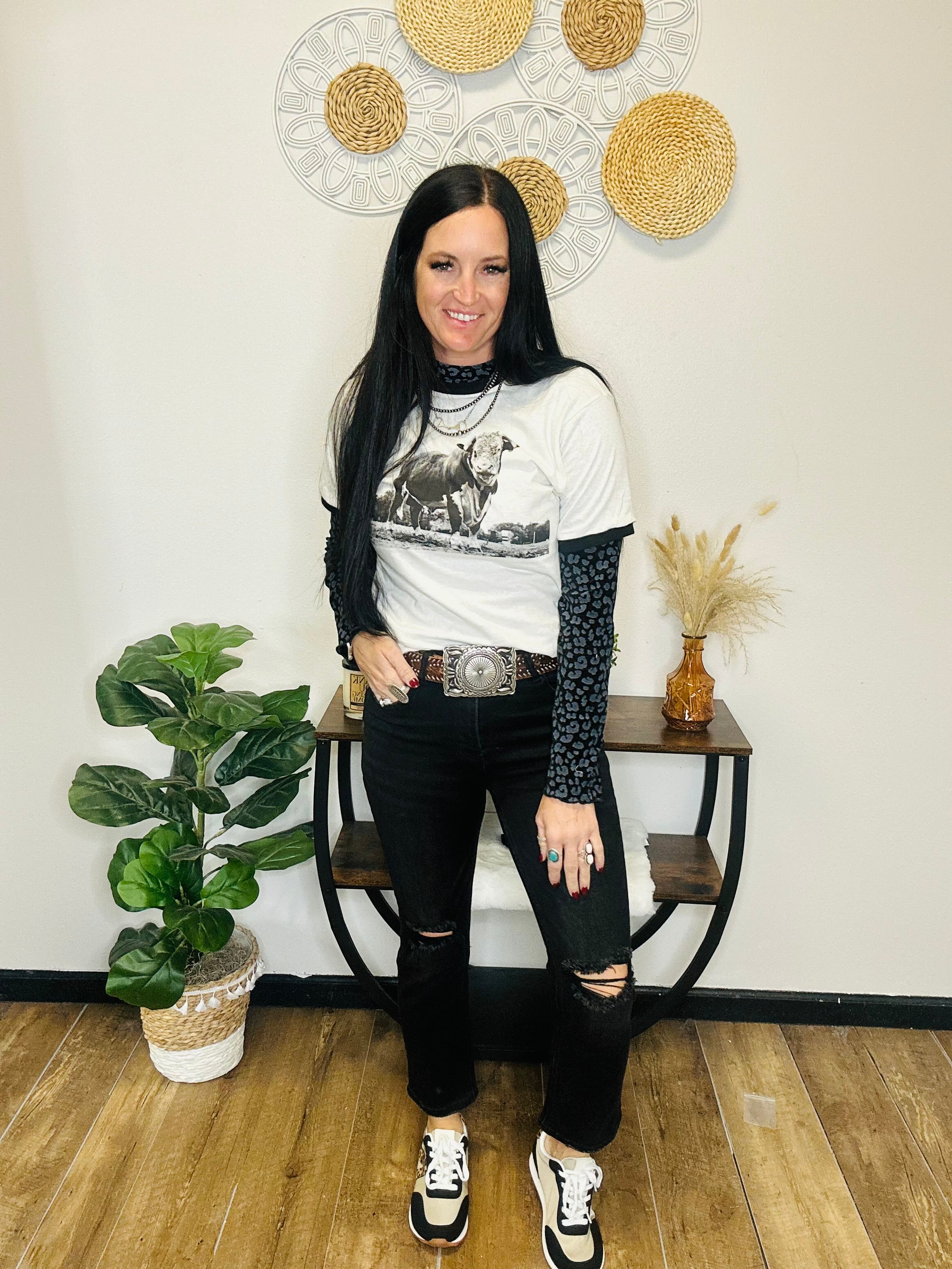 A classic ringer tee with a western twist—this one is a total wardrobe win. The Horned Bull Graphic Tee brings that bold Hereford energy while keeping things lightweight, comfy, and perfectly casual. The contrast trim gives it that vintage-inspired vibe we all love, making it an easy grab for denim days, rodeo nights, or anywhere you want to show off a little western personality without trying too hard.