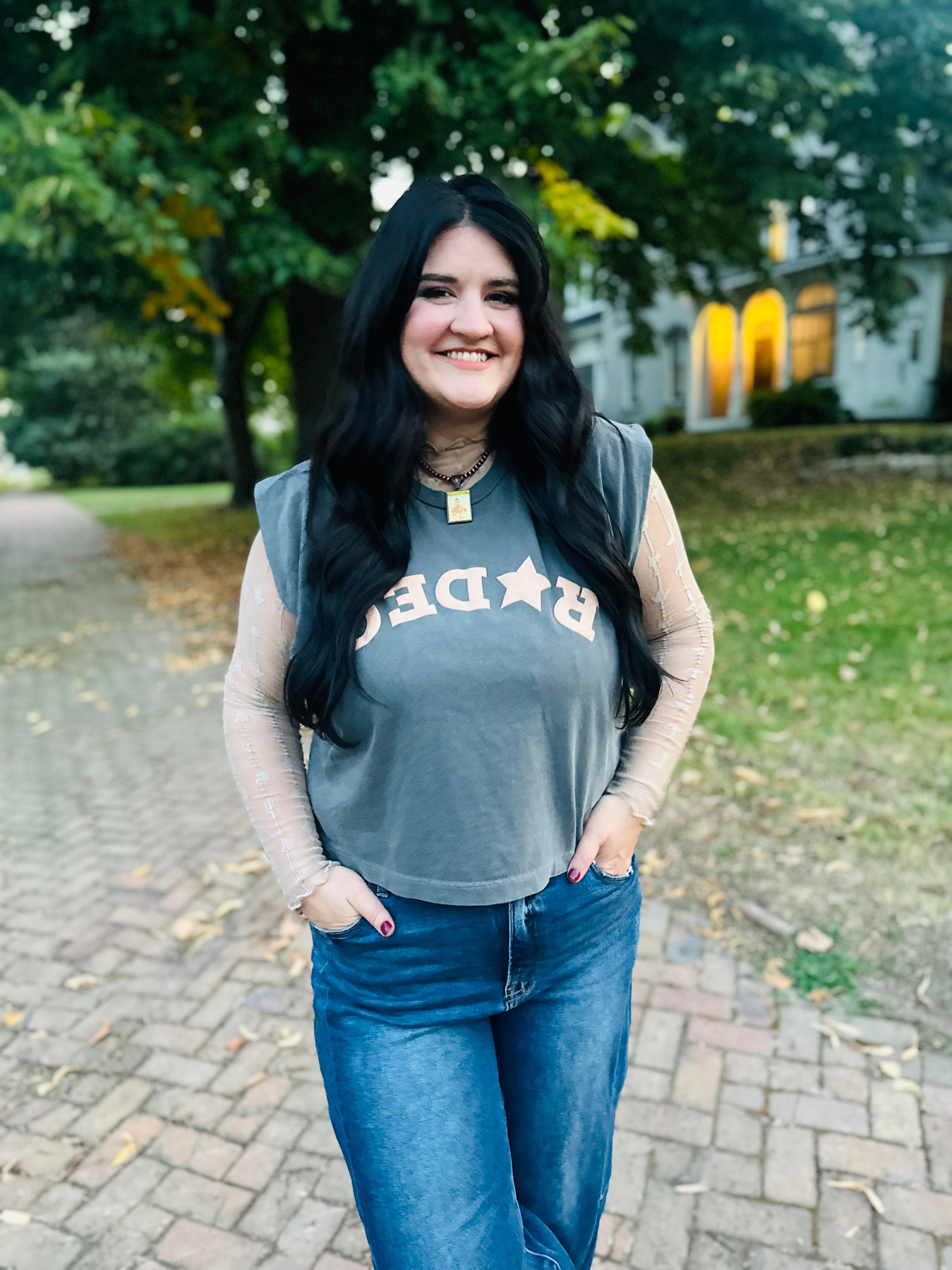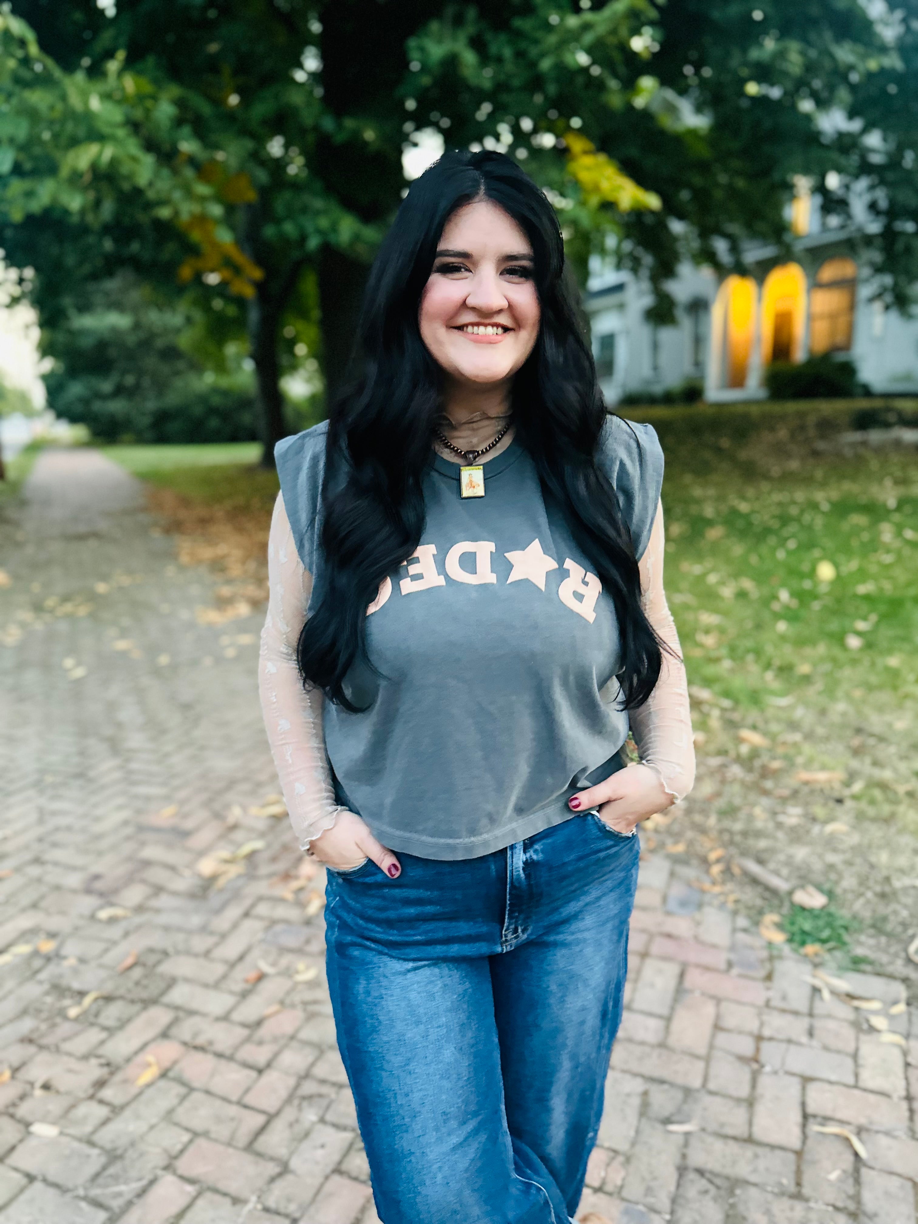 Sleeveless Slightly Cropped Grey Muscle Tank with Tan Puff Upside Down "Rodeo" Graphic