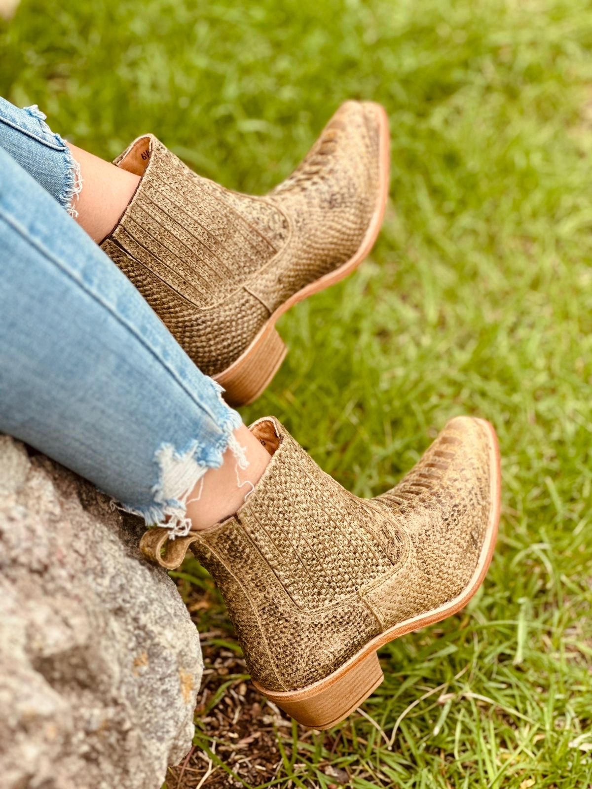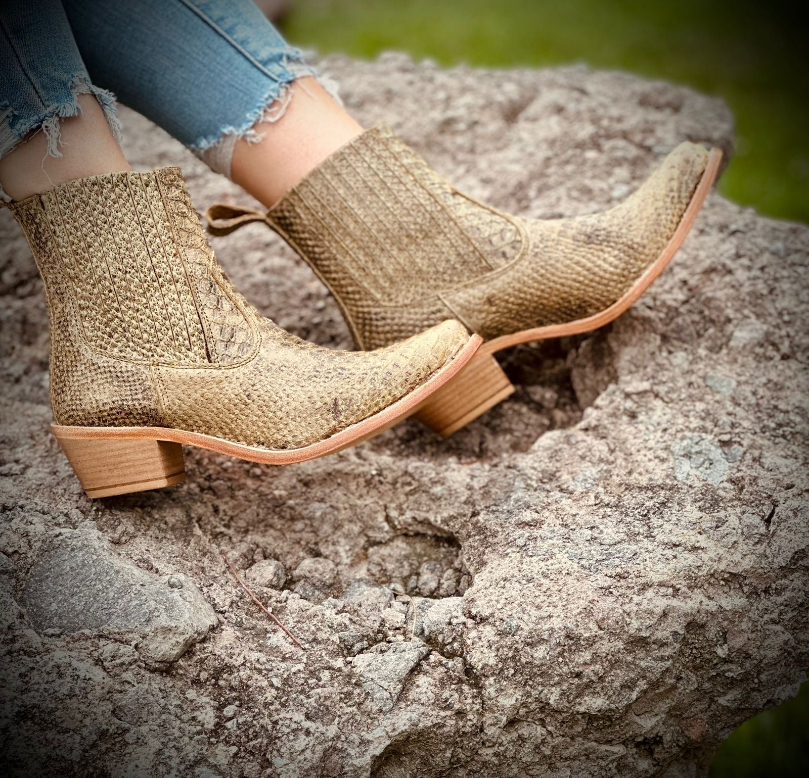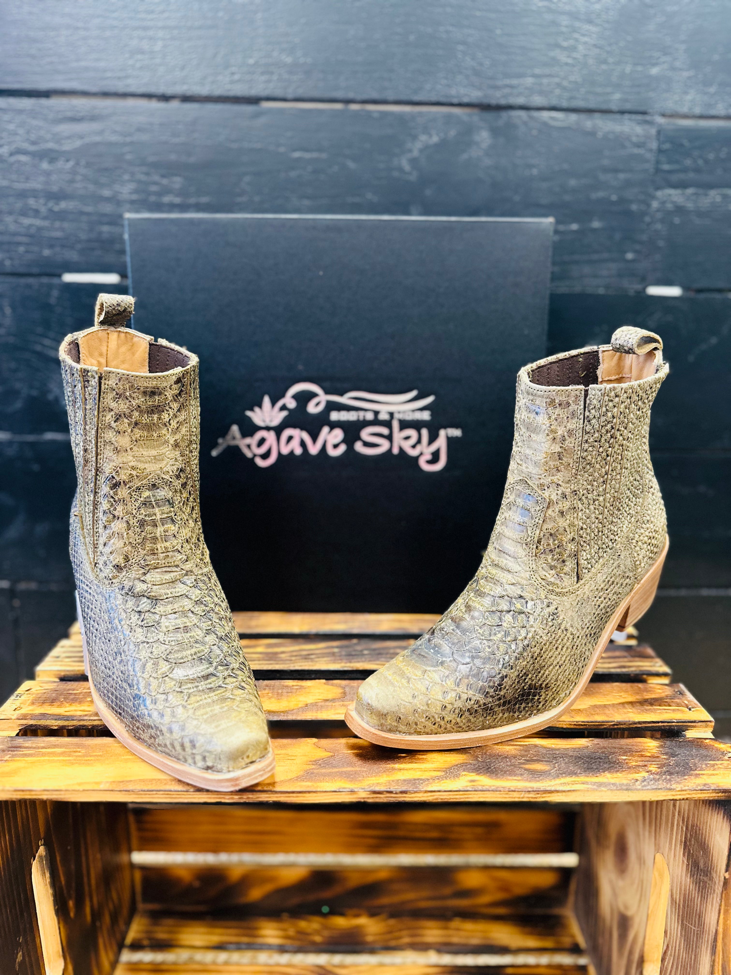 Step into the wild side with our Agave Sky Paige Olive Python Boots! These sassy ankle cowboy boots feature an eye-catching olive python pattern that's as unique as you are. With a comfy cushioned insole and just-right 2 1/4" stacked heel, they're perfect for strutting your stuff all day long. Each pair has its own personality since color and texture vary naturally. True to size and ready for adventure – these boots were made for talking about!