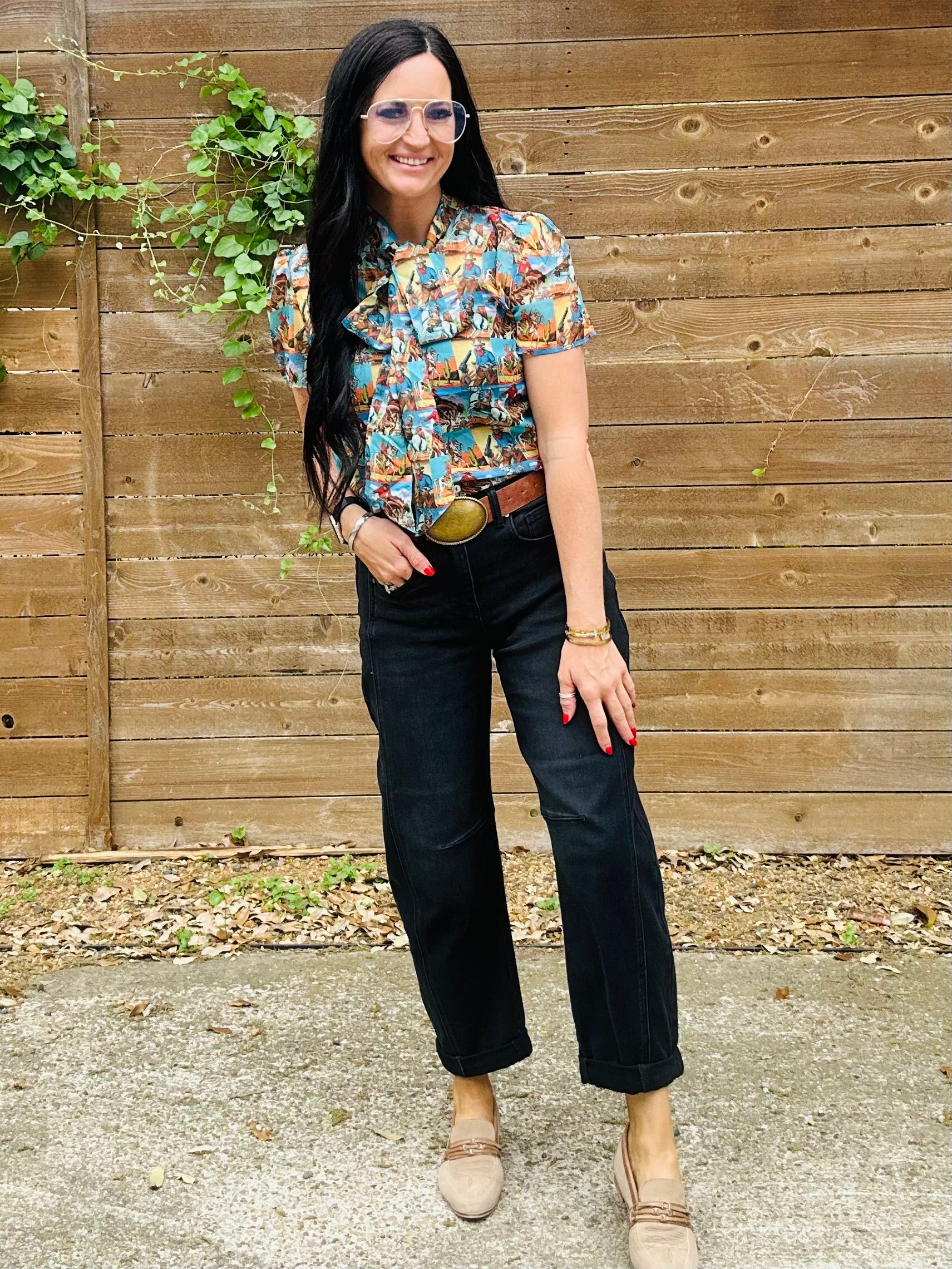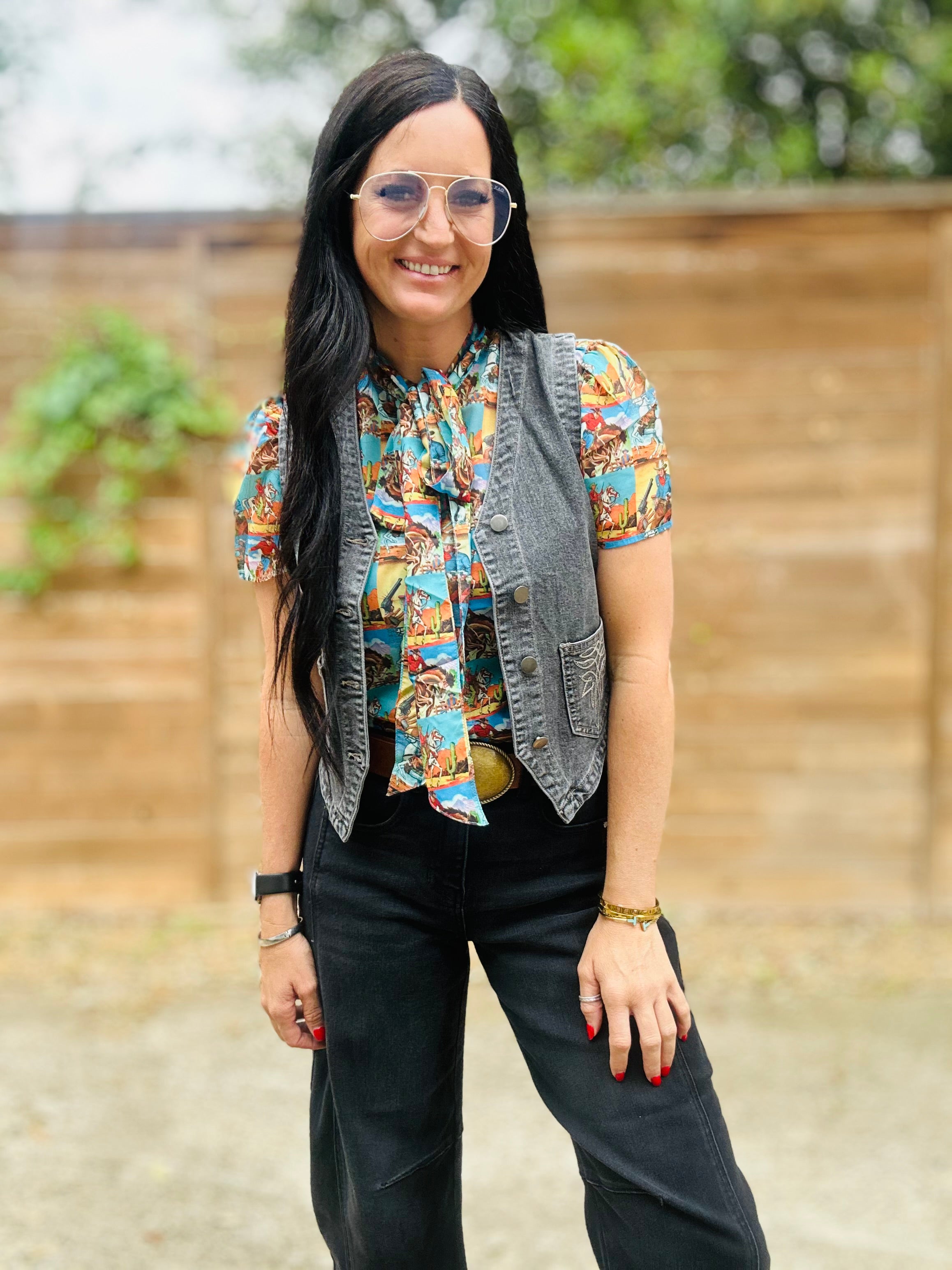 Women's Short Sleeve Semi- Sheer Cowboy Blouse with Tie Neck