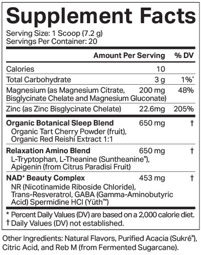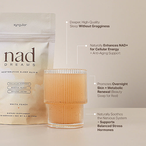 The best days begin with better nights—and NAD Dreams makes beauty sleep work for you. This delicious white peach elixir helps you wind down, recover deeply, and wake up feeling refreshed, not groggy. Packed with powerful minerals, adaptogens, nootropics, and NAD+ activators, it supports your body’s natural overnight repair process, helping you glow from the inside out.