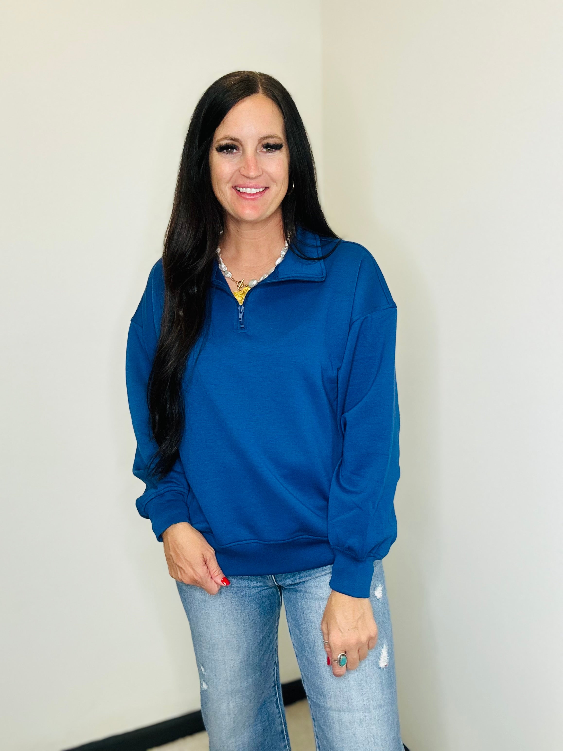 Say hello to your new go-to pullover. The Zuri Scuba Half Zip is that effortless, throw-on-and-go piece that still makes you feel put-together. Made from ultra-soft scuba fabric, this pullover features a relaxed fit, cozy long sleeves, and a half zip collar that adds just the right touch of sporty chic. And yes—it has pockets!