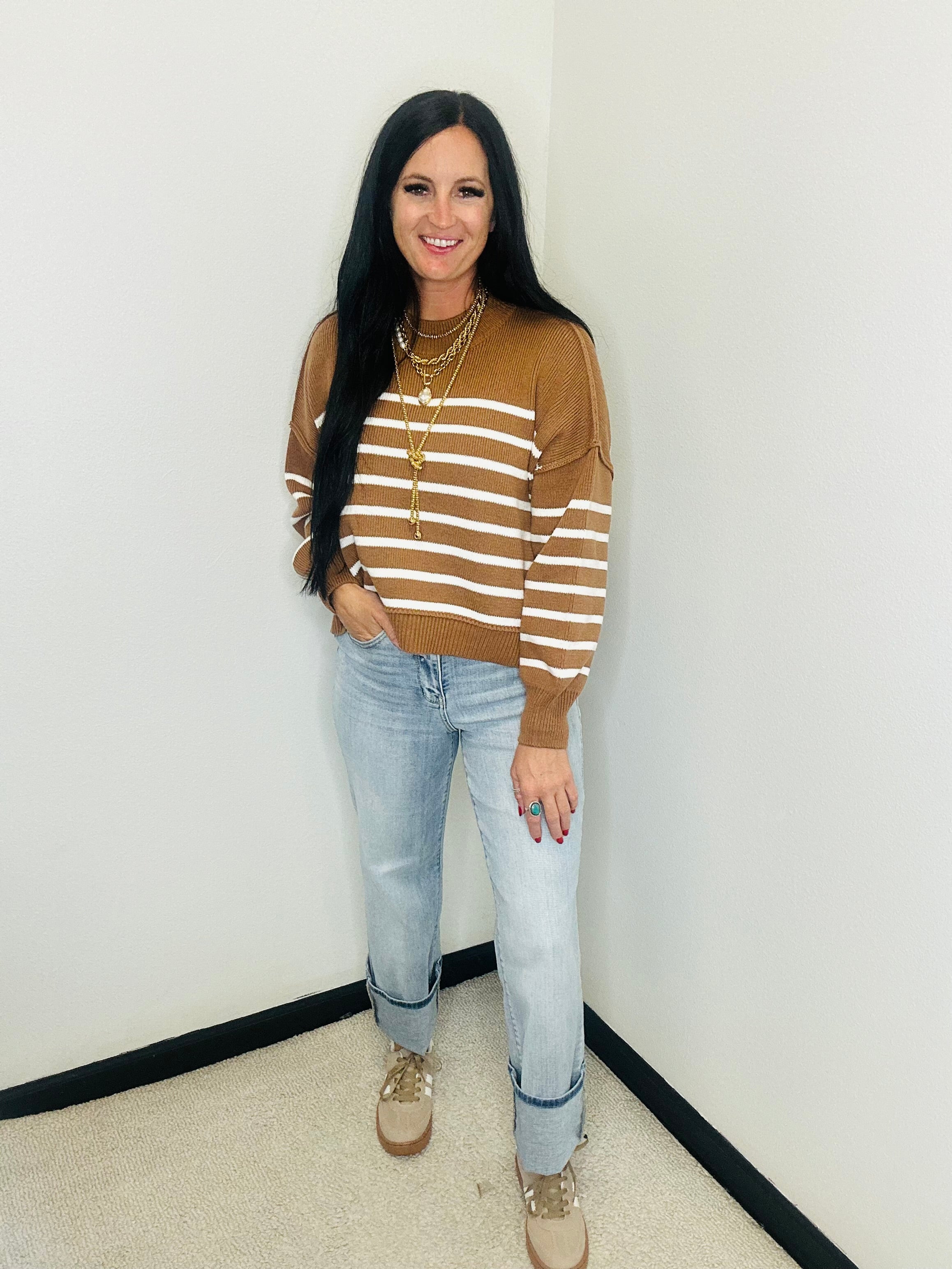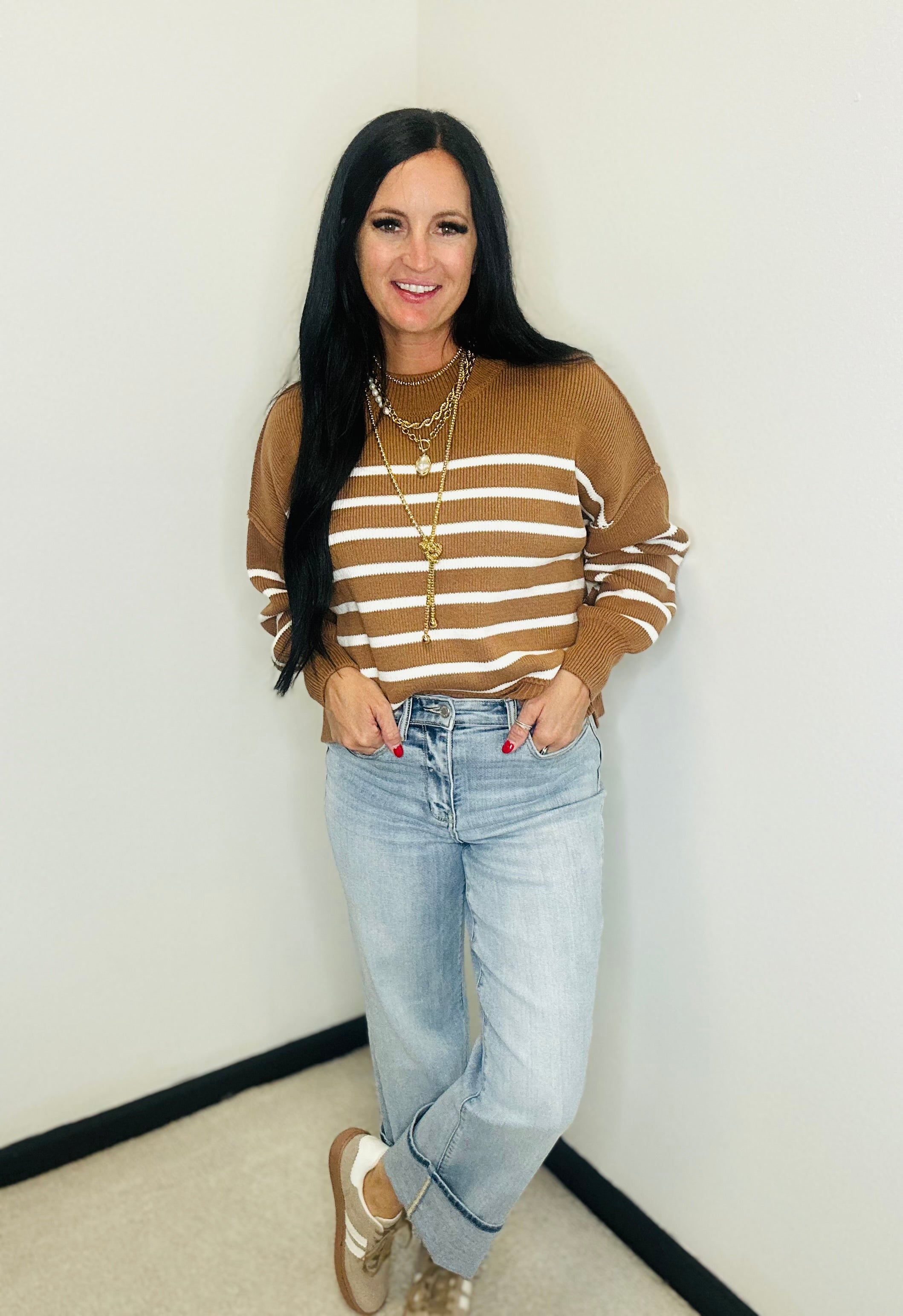 Women's Oversized Long Sleeve Camel & Ivory Striped Sweater