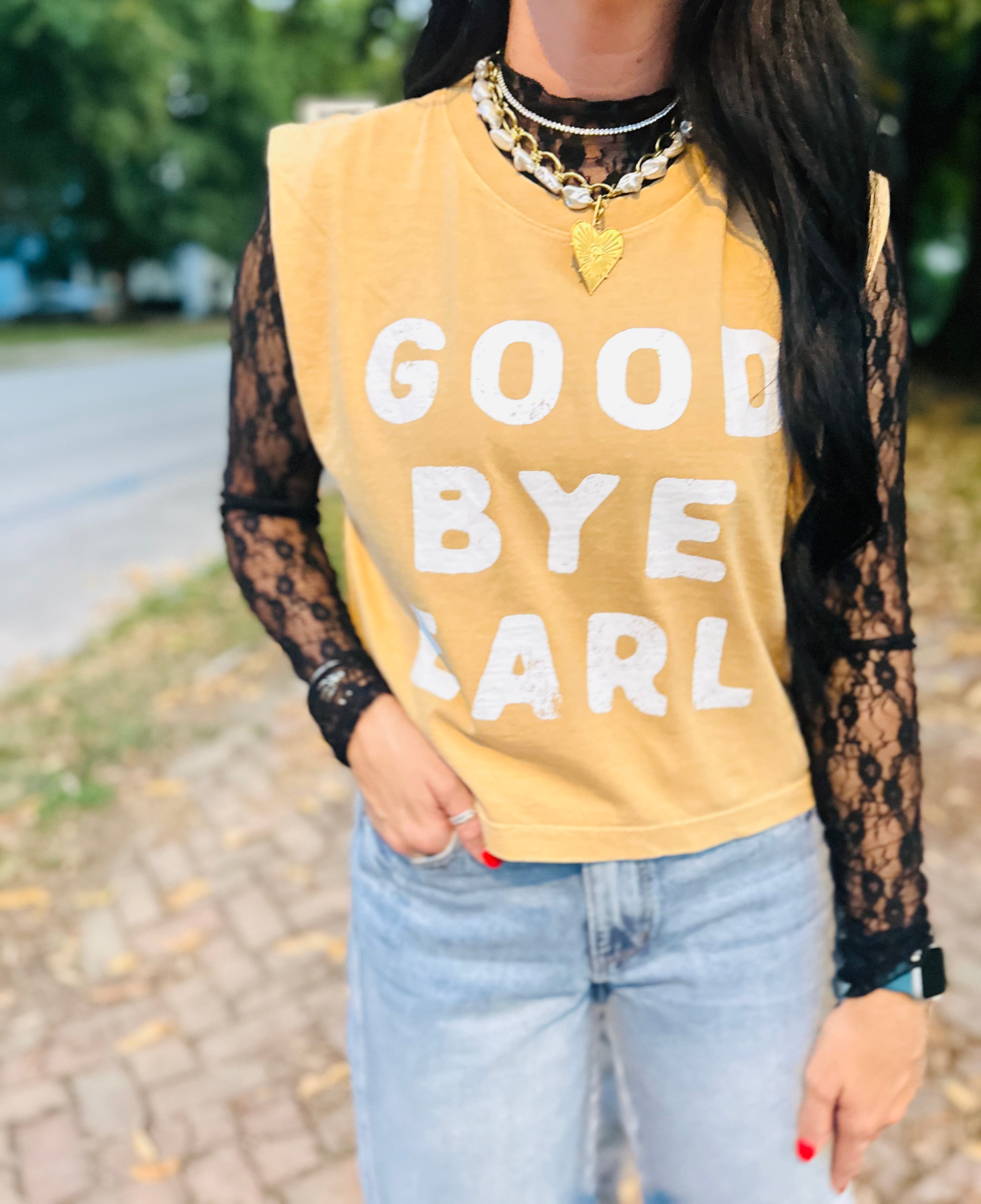 Make a bold (and playful) statement with our Good Bye Earl Graphic Tank 🌻. Designed in a vintage-faded gold, this sleeveless muscle-style tee is slightly cropped for that effortless, laid-back vibe. The white retro-inspired lettering adds the perfect pop, making this top as fun as it is unique.