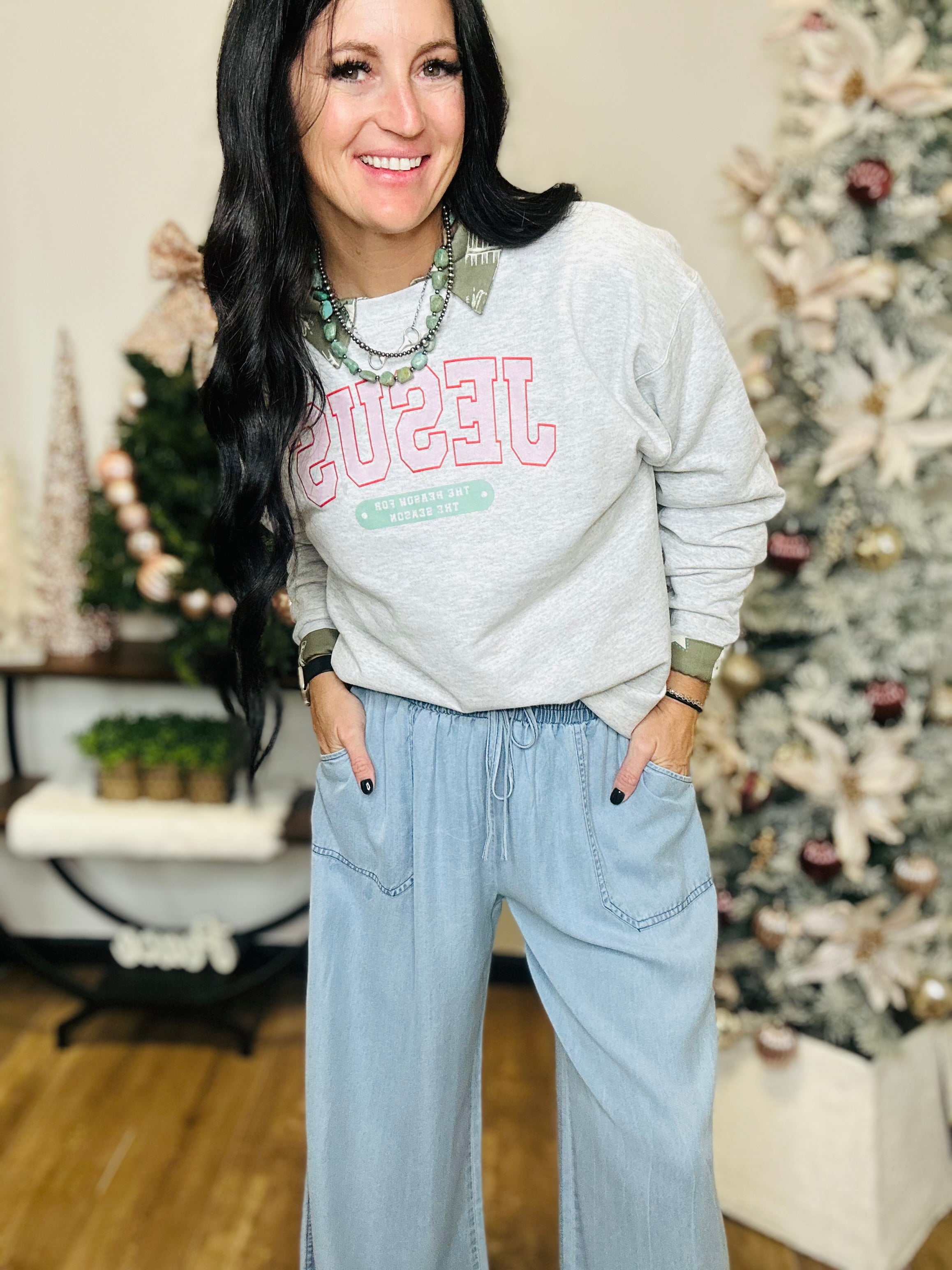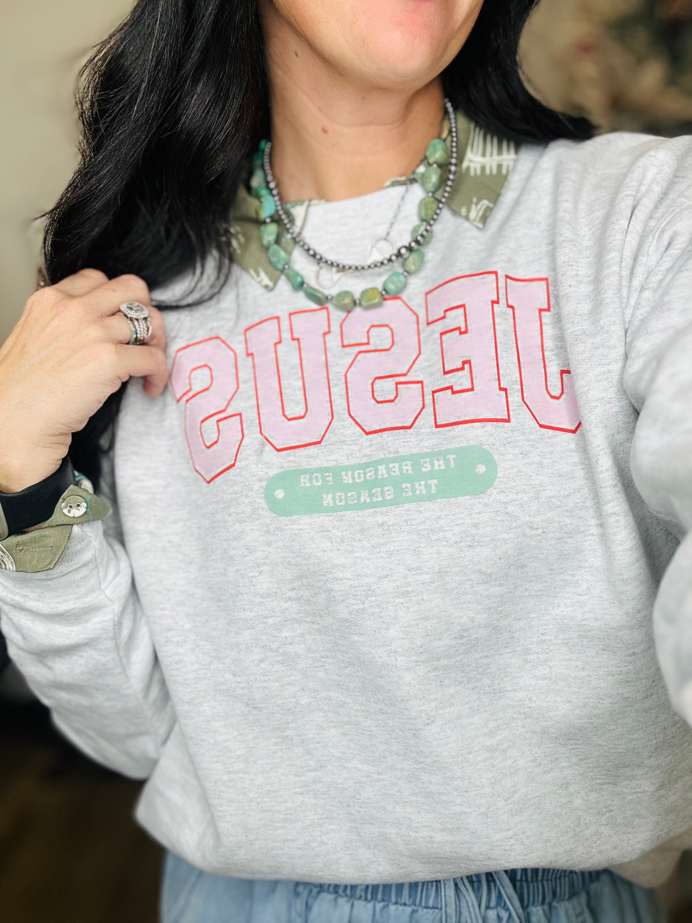 Soft Long Sleeve Grey Pullover with "JESUS the Reason for the Season" Graphic in Pink and Green